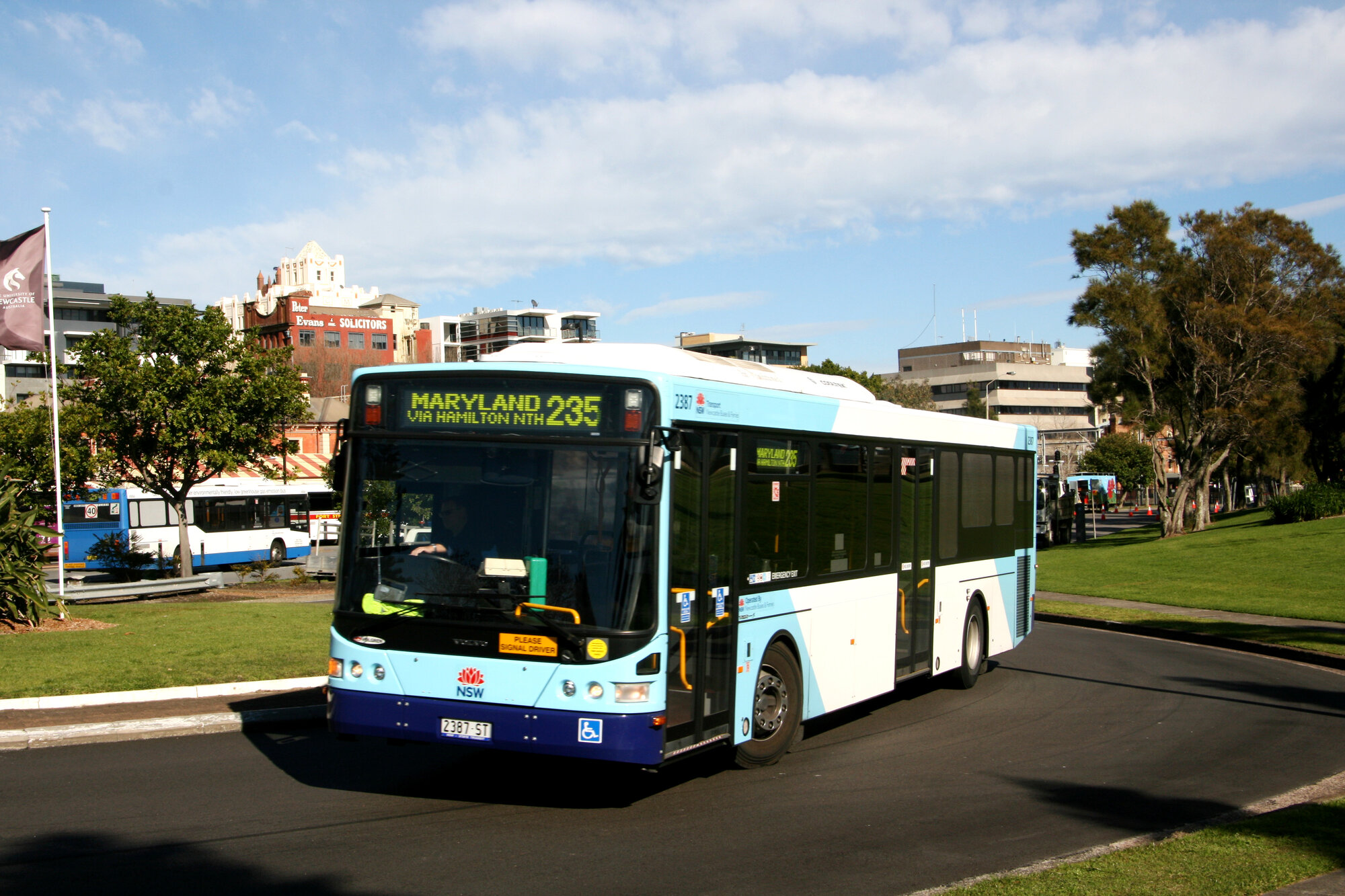 Ward, John, STA Volvo B7RLE 2387 & 2 other buses, Wharf Road at roundabout with Watt Street, Newcastle, NSW, 6 August 2013 (6th August 2013), [36770_060813]. Living Histories, accessed 15/04/2026, https://livinghistories.newcastle.edu.au/nodes/view/91883