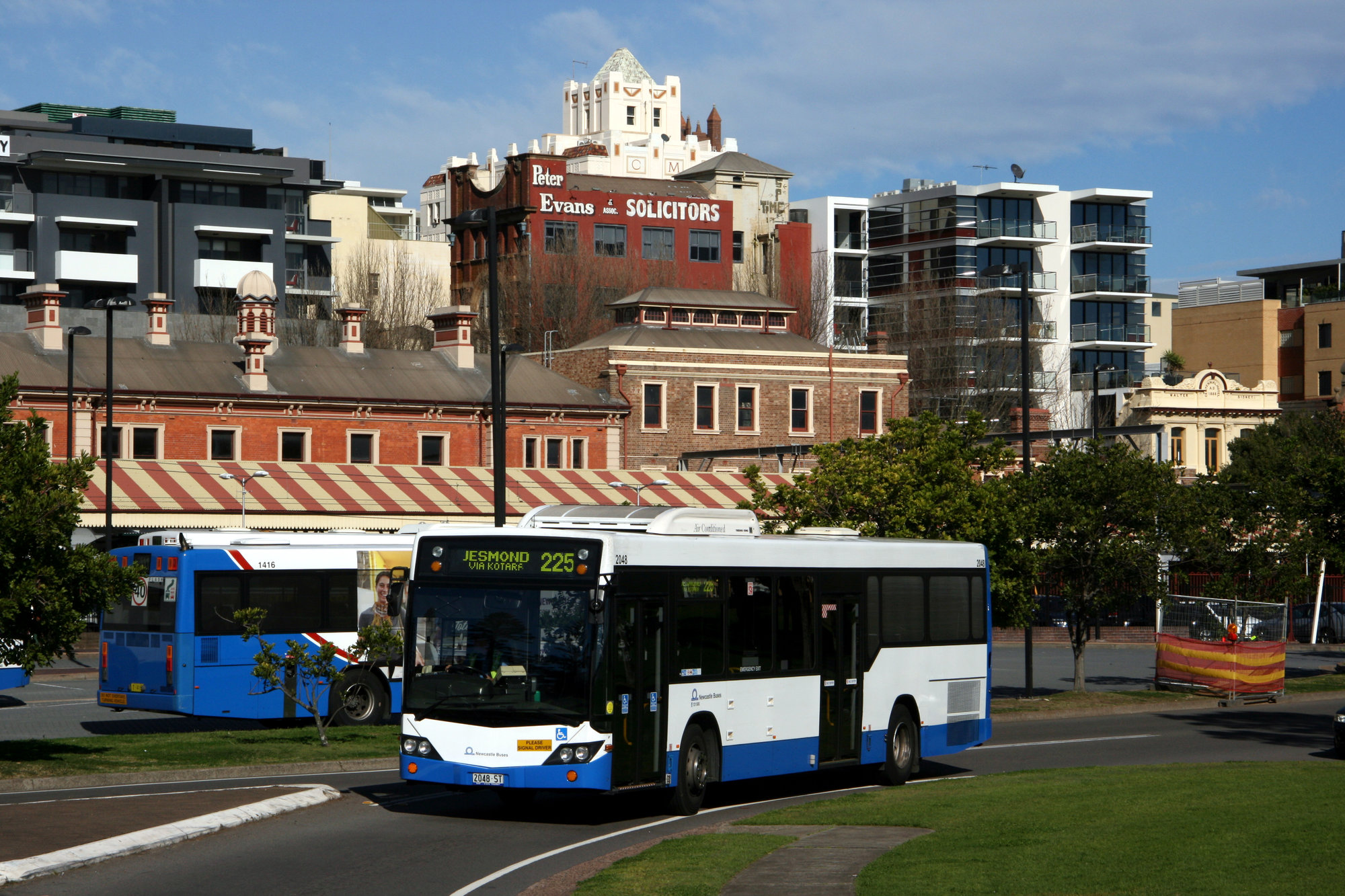 Ward, John, STA Volvo B12BLEs 2048, 1416 & 2 other buses, Wharf Road at roundabout with Watt Street, Newcastle, NSW, 6 August 2013 (6th August 2013), [36771_060813]. Living Histories, accessed 16/04/2026, https://livinghistories.newcastle.edu.au/nodes/view/91884