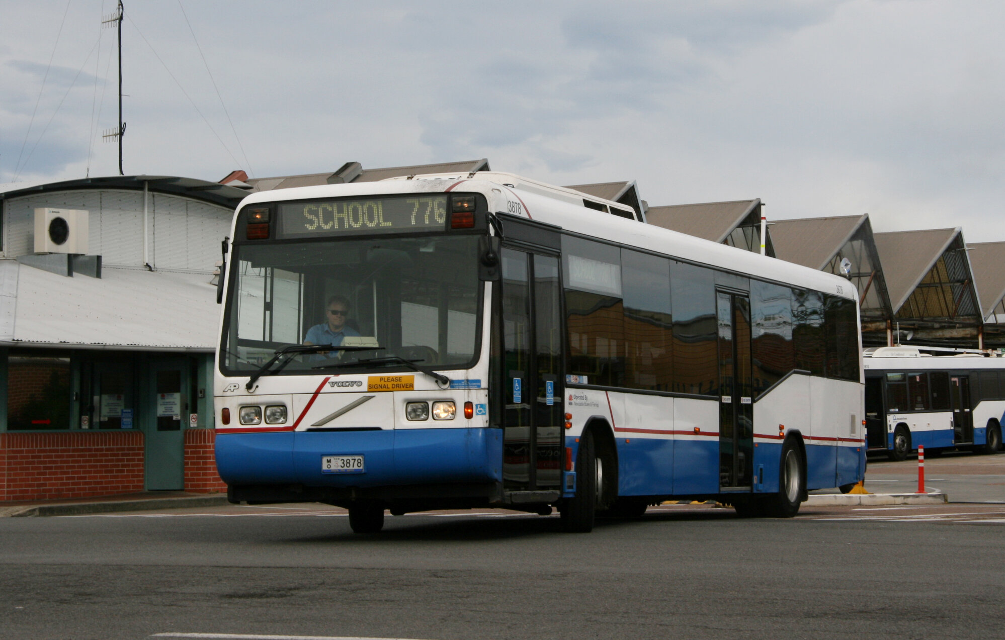 STA Volvo B10BLE 3878, Volvo B12BLE 1610 leaving depot yard, Denison Street, Hamilton, NSW, 6 August 2013