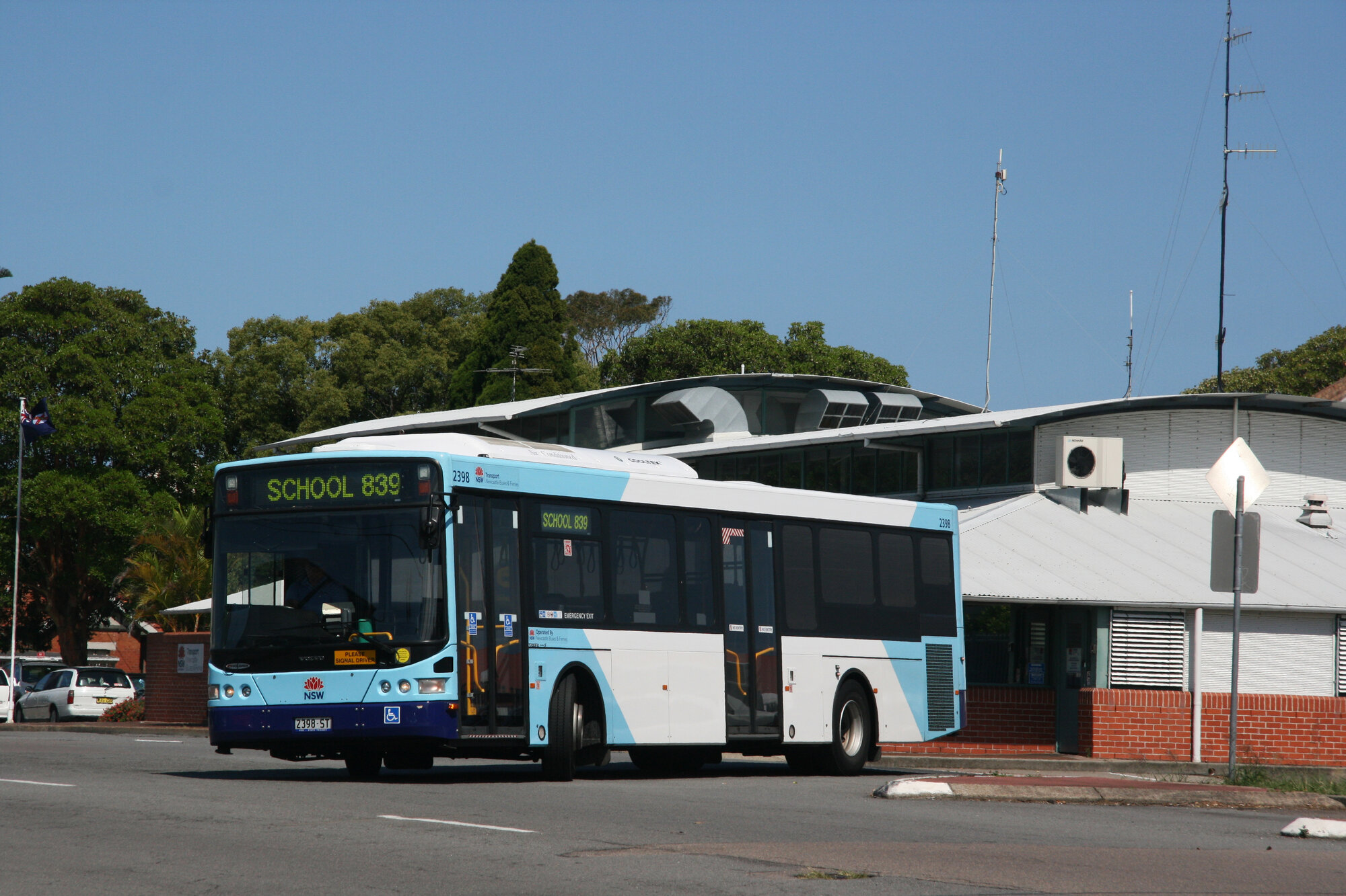 STA Volvo B7RLE 2398 leaving depot for Denison Street, Hamilton, NSW, 15 November 2013