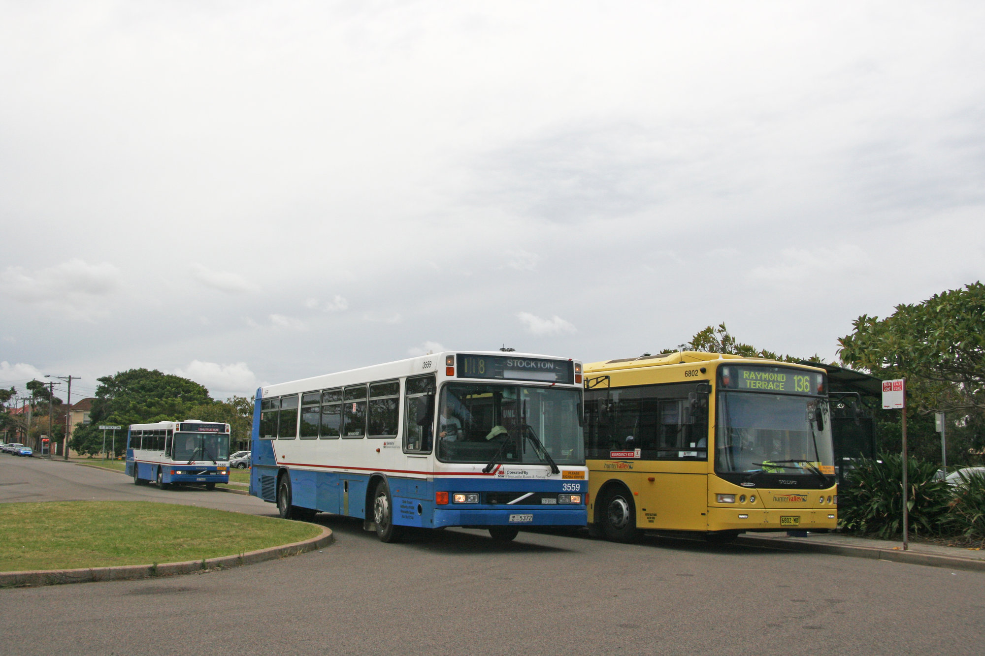 CDC, Volvo B7R 6802-MO, STA Volvo B10Bs 5372 (3559) & 5682 (3560), Tour, terminus, Mitchell Street, Stockton, NSW, 16 November 2013