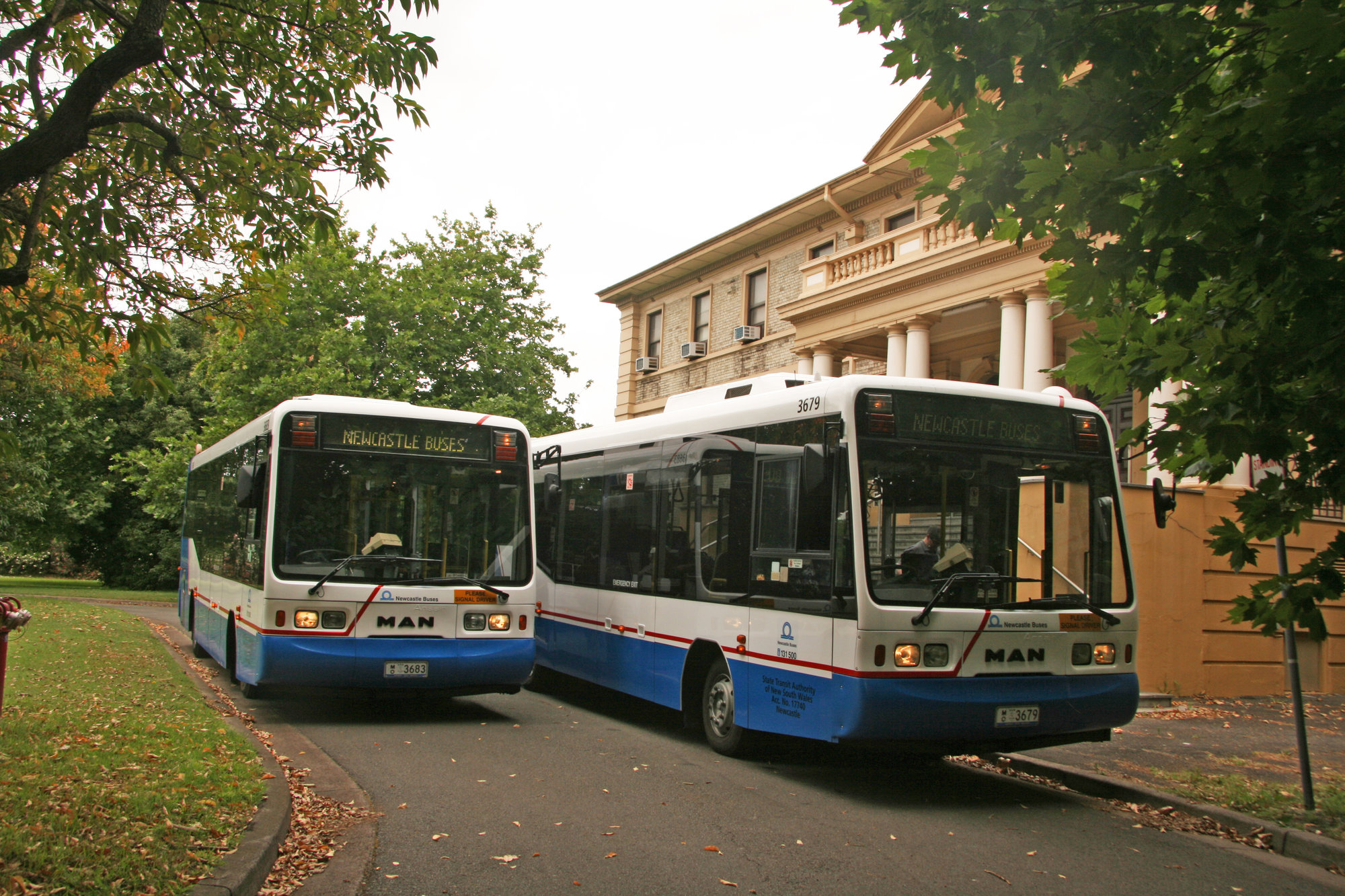 STA M.A.N 11.220s 3683 3679, Tour outside administration building off Administration Drive, Mayfield East, NSW, 16 November 2013