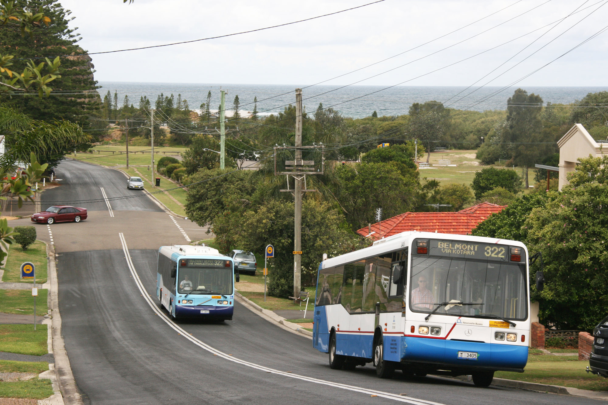 Ward, John, STA Mercedes O405, 3405, Volvo B10BLE 3877, Beach Road, Redhead, NSW, 16 November 2013 (16th November 2013), [37452_161113]. Living Histories, accessed 18/03/2026, https://livinghistories.newcastle.edu.au/nodes/view/92175