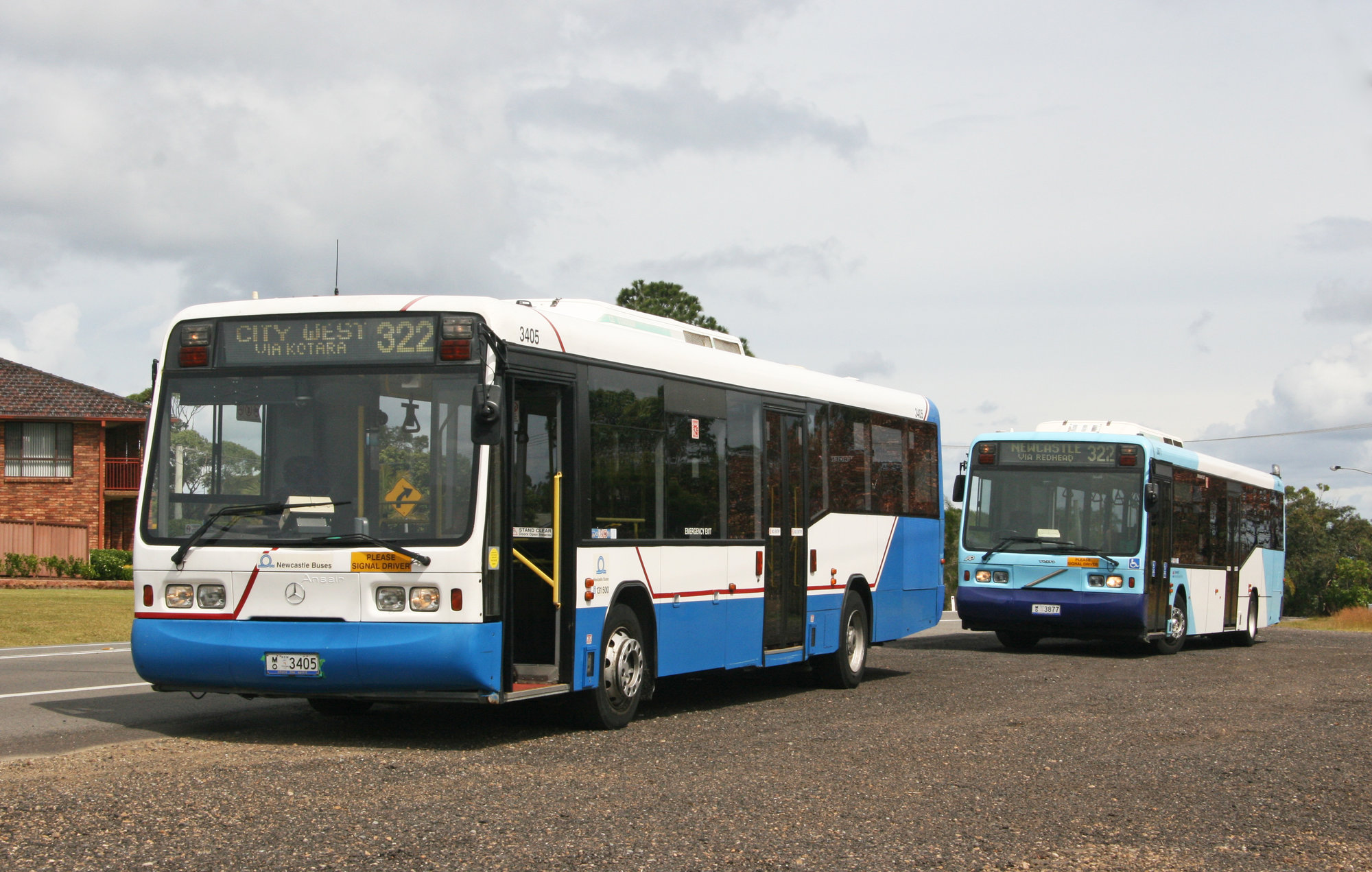 STA Mercedes O405, 3405, Volvo B10BLE 3877, Redhead Road, Redhead, NSW, 16 November 2013