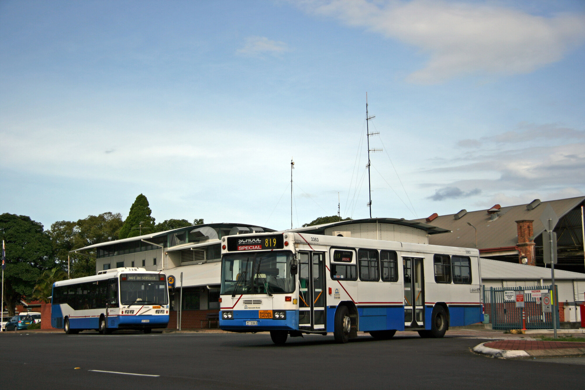 STA Mercedes O405, MK V 3363, Volvo B10BLE 3880, depot yard to Denison Street, Hamilton, NSW, 8 April 2014