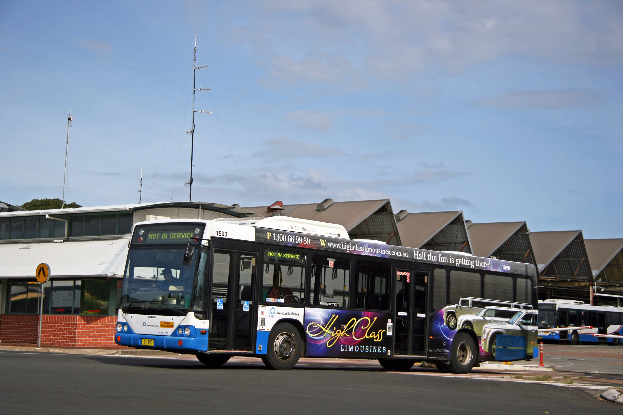 Ward, John, STA Volvo B12BLEs 1590 all over ad & 1423, depot yard to Denison Street, Hamilton, NSW, 8 April 2014 (8th April 2014), [38066_080414]. Living Histories, accessed 24/01/2026, https://livinghistories.newcastle.edu.au/nodes/view/92210