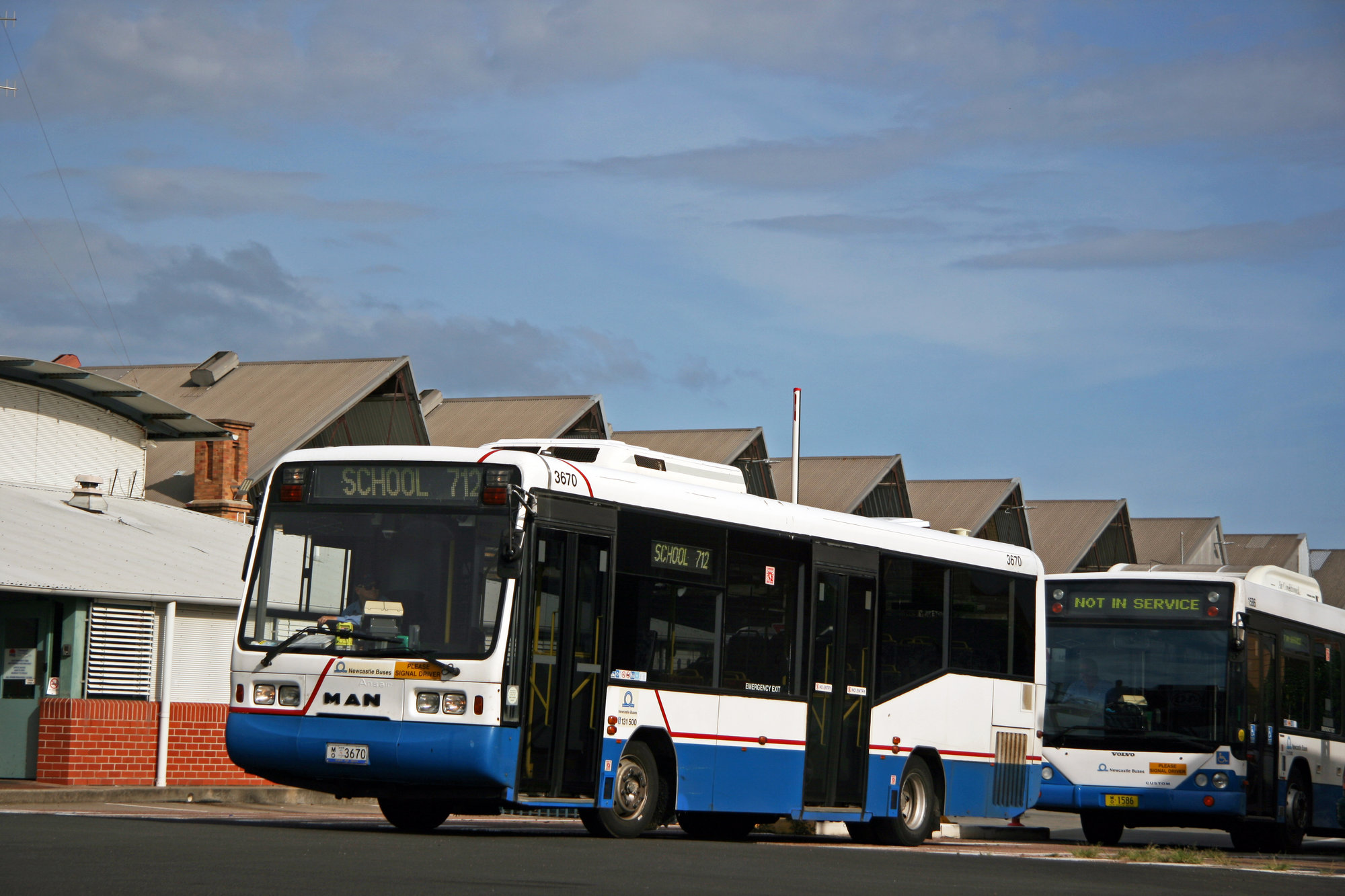 Ward, John, STA MAN 11.220 HOCL 3670 &, Volvo B12BLE 1586, depot yard to Denison Street, Hamilton, NSW, 8 April 2014 (8th April 2014), [38072_080414]. Living Histories, accessed 17/04/2026, https://livinghistories.newcastle.edu.au/nodes/view/92216