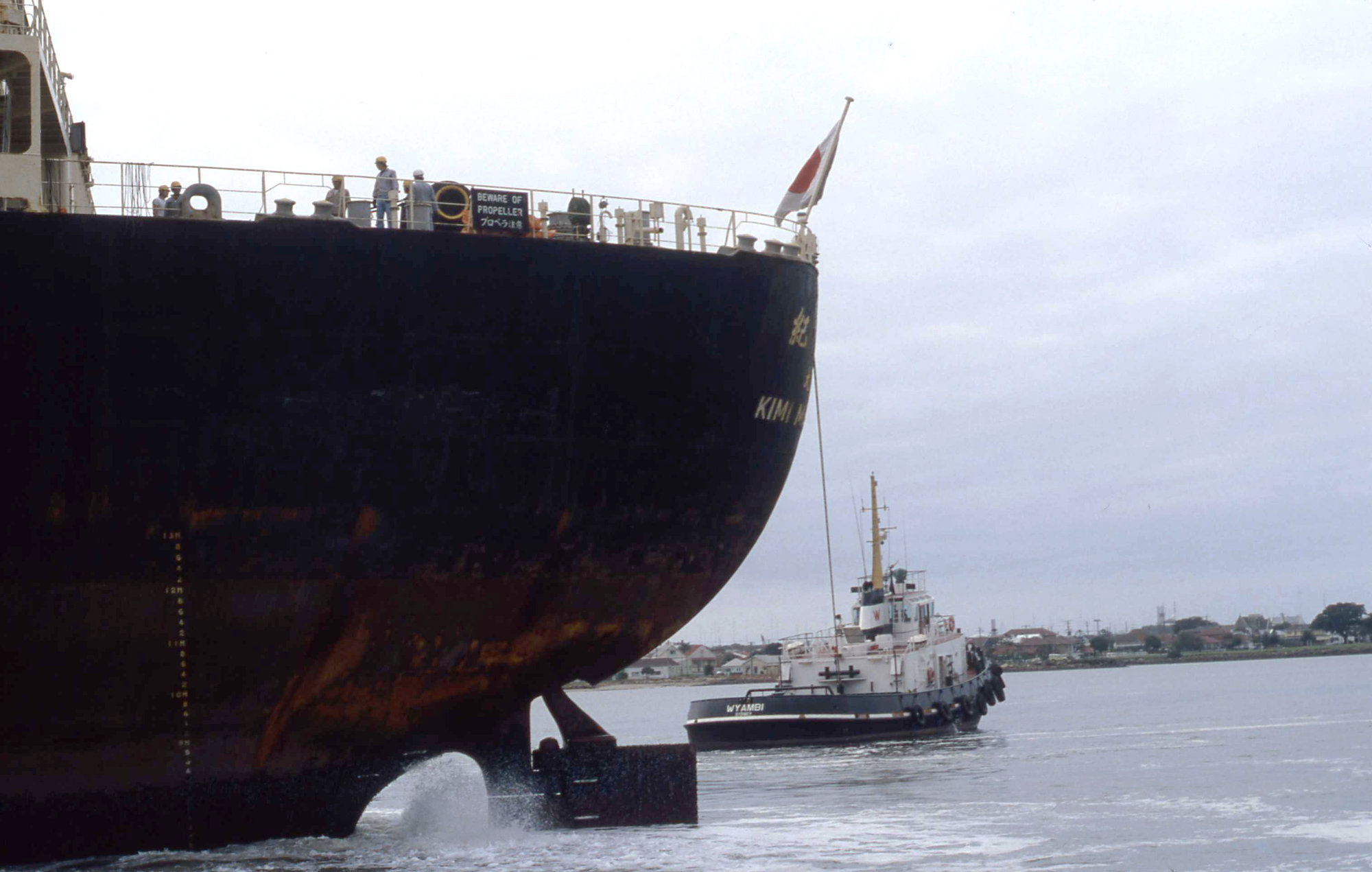 Ward, John, Vessel Kimihata Maru being pulled from stern by Tug Wyamabi, port, Hunter River, Newcastle, NSW, April 1981 (1981-04), [00993_000481]. Living Histories, accessed 09/03/2026, https://livinghistories.newcastle.edu.au/nodes/view/92400