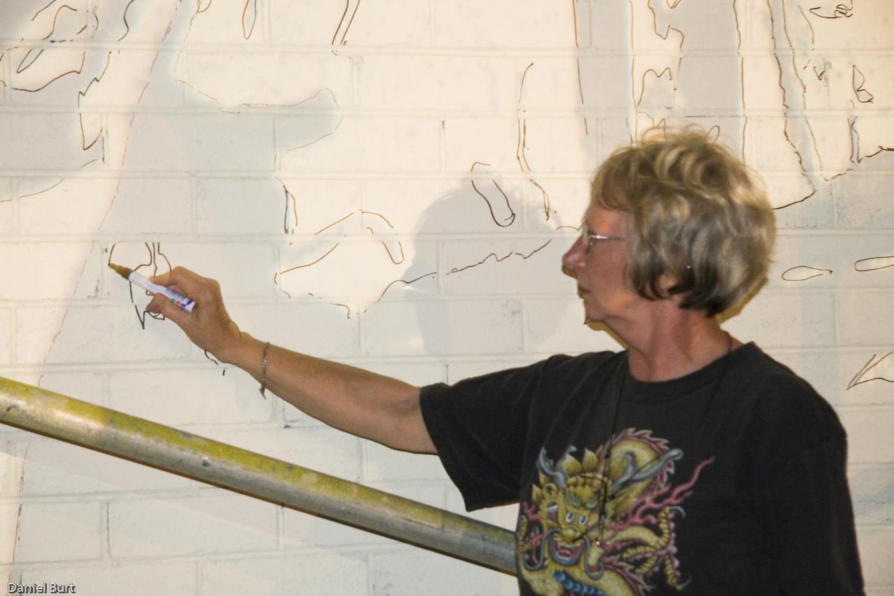 Tracing projection during creation of Stockton Mural, corner of Mitchell and Queen Street