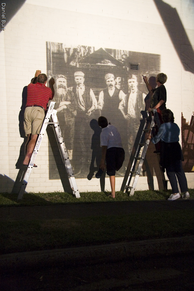 Tracing projected photo, creation of Stockton Mural, corner of Mitchell and Queen Street