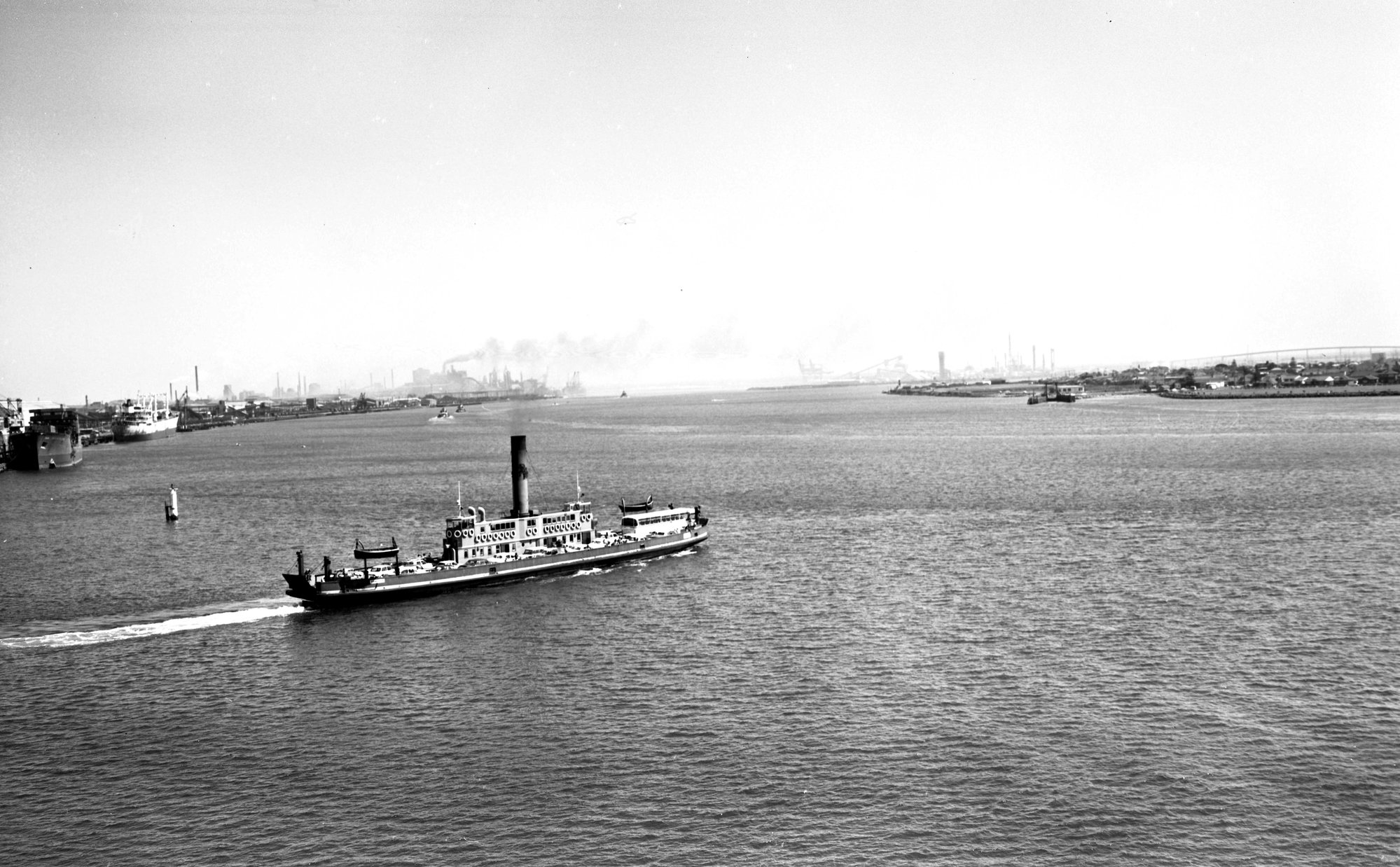DMR vehicular steam ferry Koondooloo Stockton-bound from Newcastle on Hunter River, NSW, 31 October 1971