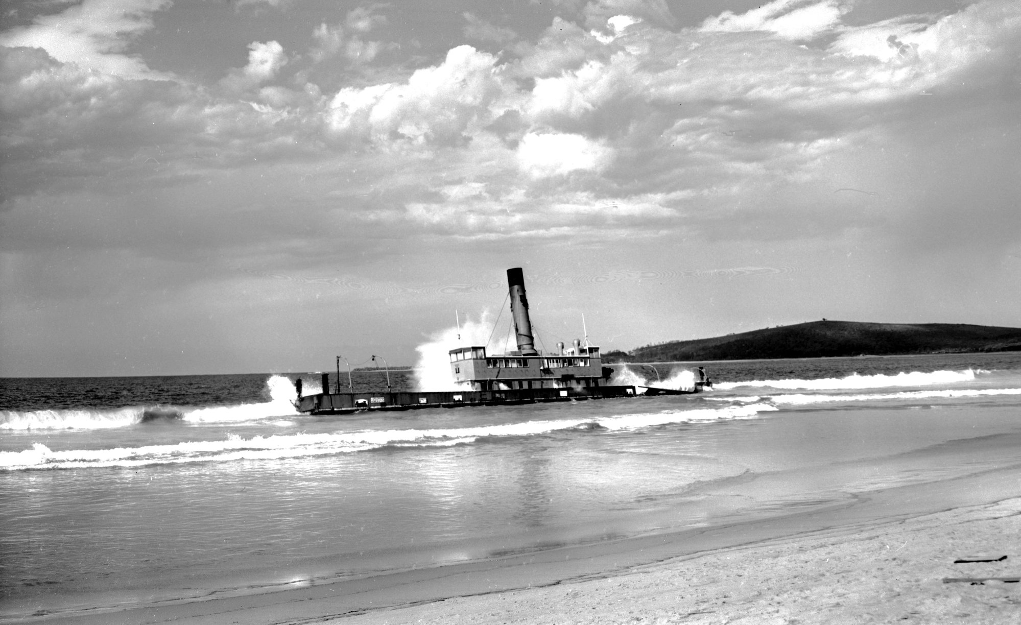 Ex DMR vehicular ferry Lurgureena on beach at South West Rocks, NSW, 22 January 1972
