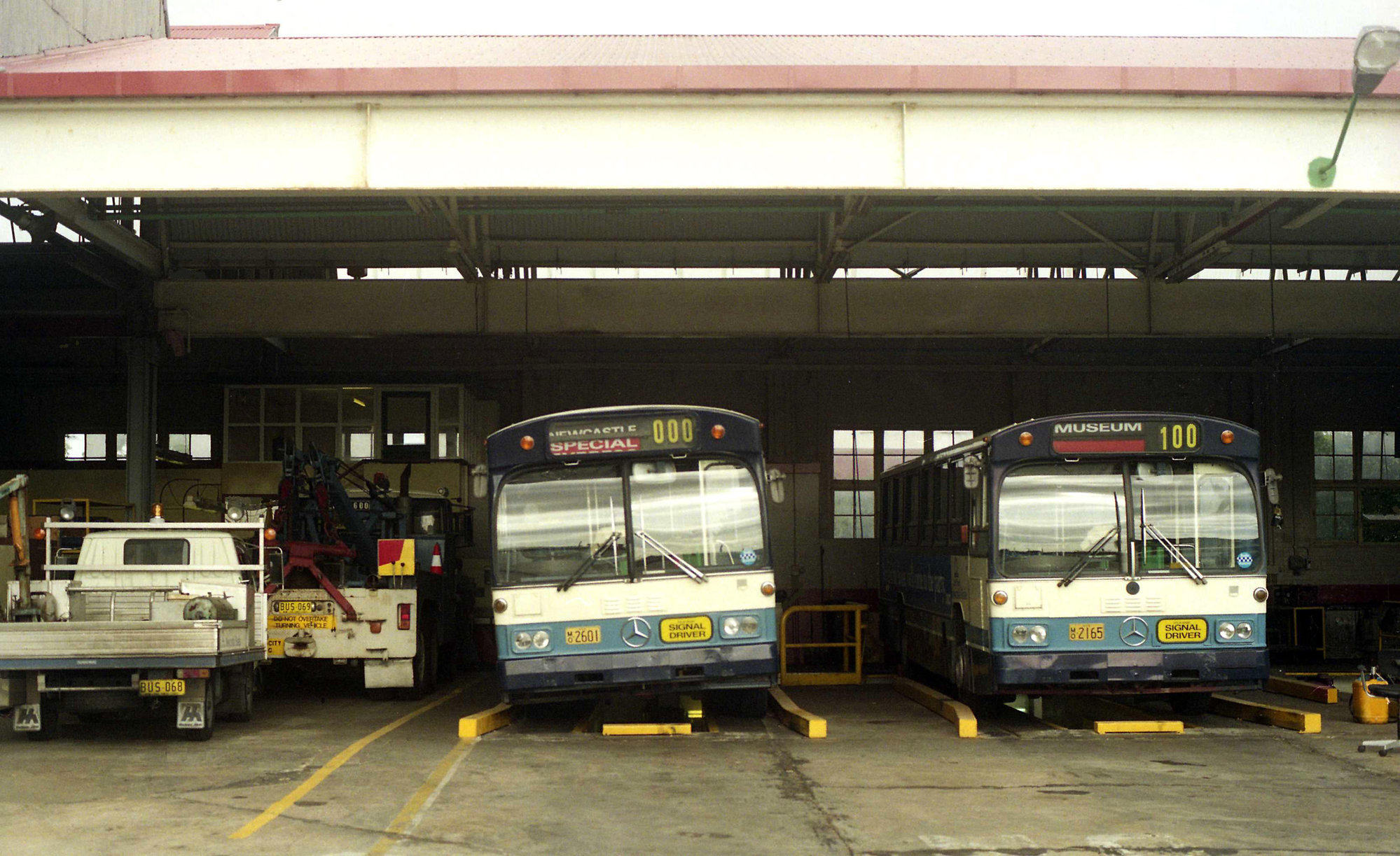 STA trucks BUS-068 & BUS-069, Mercedes 0305 MK III 2601, Mercedes 0305 MK II 2165 depot shed, Hamilton, NSW, 4 June 1994