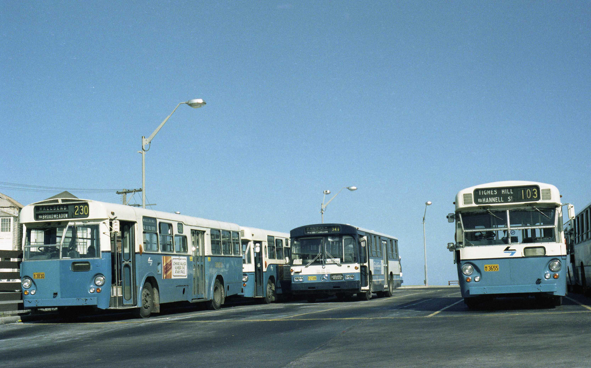 UTA Leyland Leopard MK 3830 3655 & another, Mercedes 2189, terminus, Parnell Place, Newcastle, NSW, November 1982