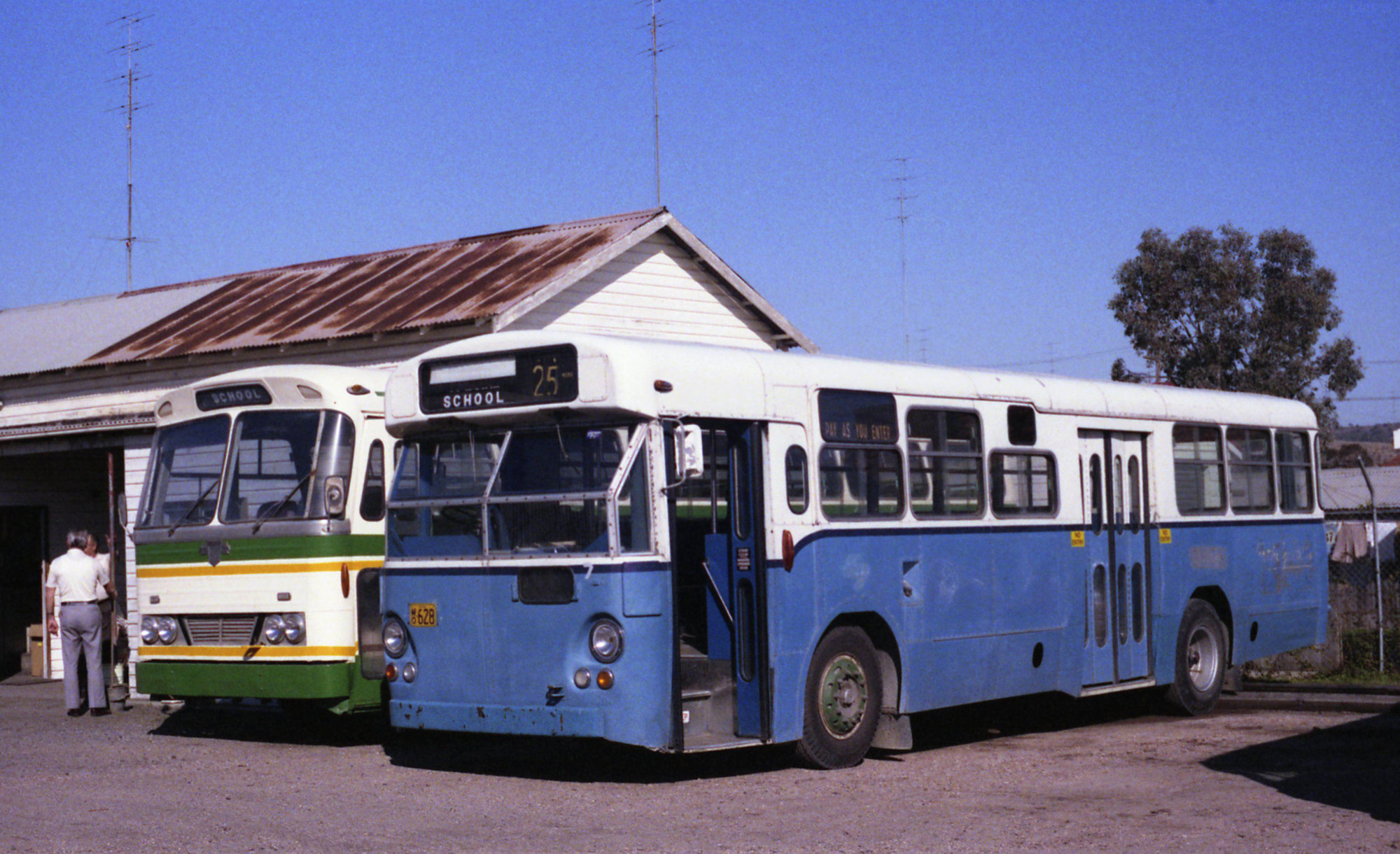 Ross Bus, Leyland unregistered, Leyland Leopard 628 (x3523), depot, Edgeworth, NSW, 3 August 1984