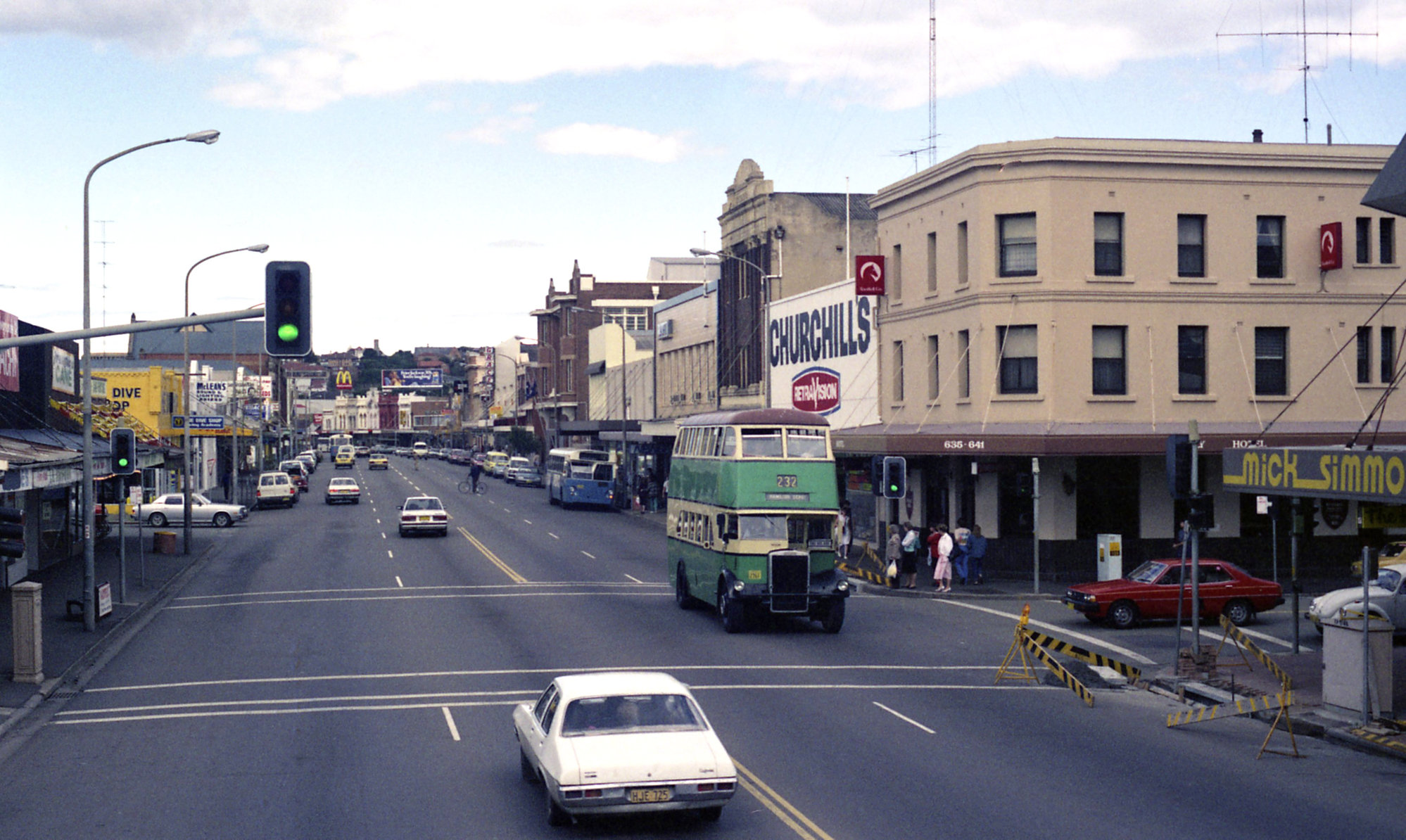 LGB Leyland OPD2-1 2761, UTA Leyland Leopard MK II xxxx, Hunter Street, at Steel Street, Newcastle West, NSW, 20 September 1986