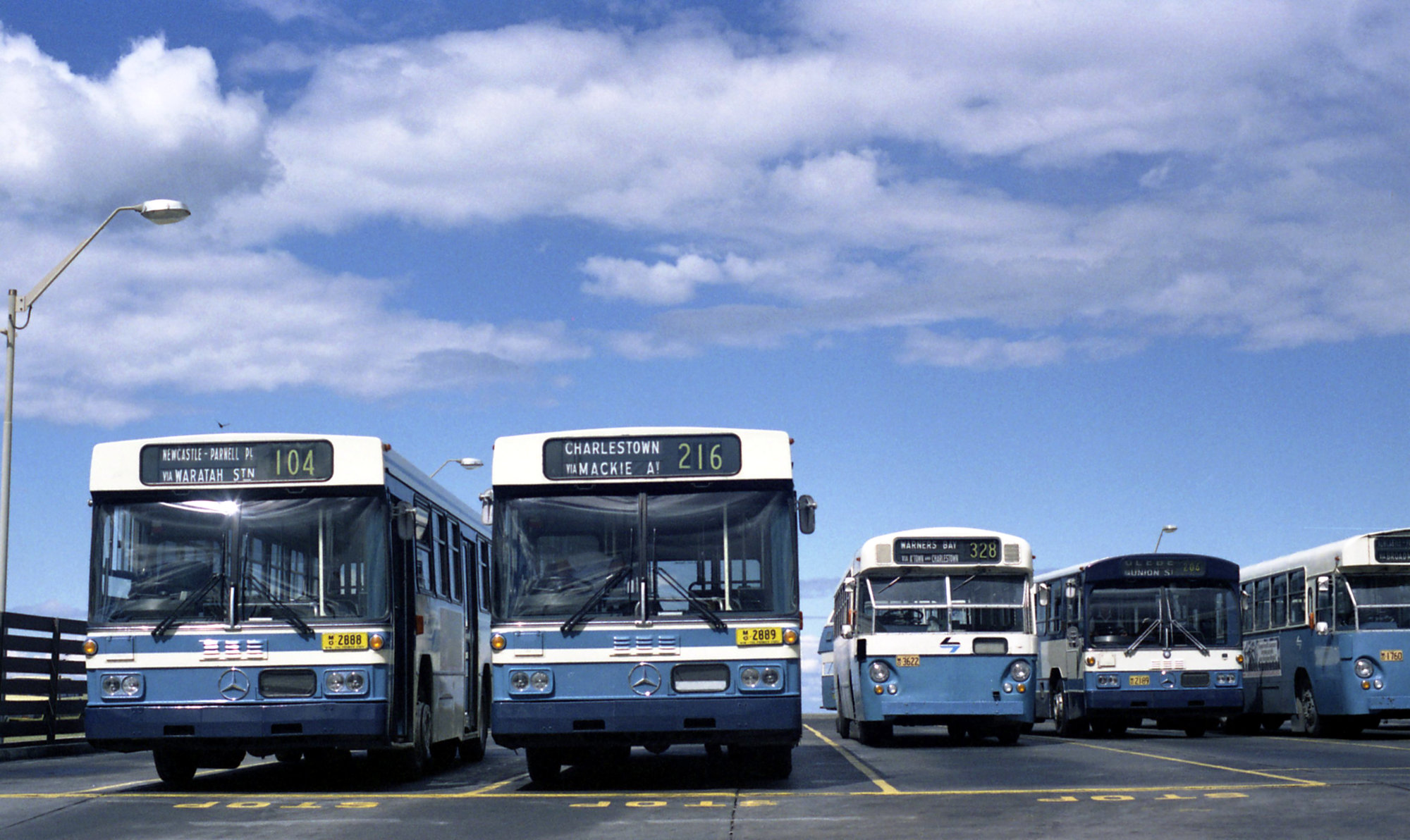 UTA Mercedes O305 MK IVs 2888 2889, Leyland Leopard MK I 3622, Mercedes 2189 Leopard MK II 1760, Parnell Place, Newcastle, NSW, 20 September 1986