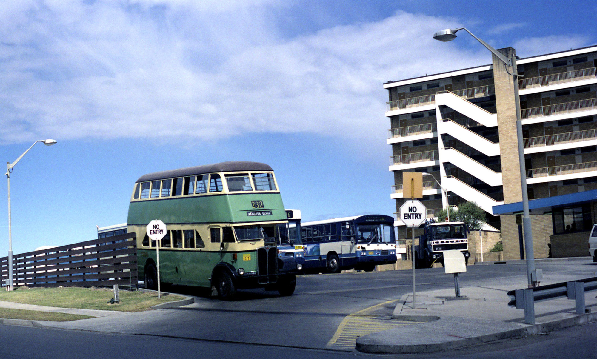 Ward, John, S Savage, AEC Regent III 017 (1995) UTA Mercedes O305 MK IV 2889, Mercedes 2189, Leyland Tow truck CT-187, Parnell Place, Ne, NSW, 20 September 1986 (20th September 1986), [22990_200986_8617]. Living Histories, accessed 10/03/2026, https://livinghistories.newcastle.edu.au/nodes/view/93011