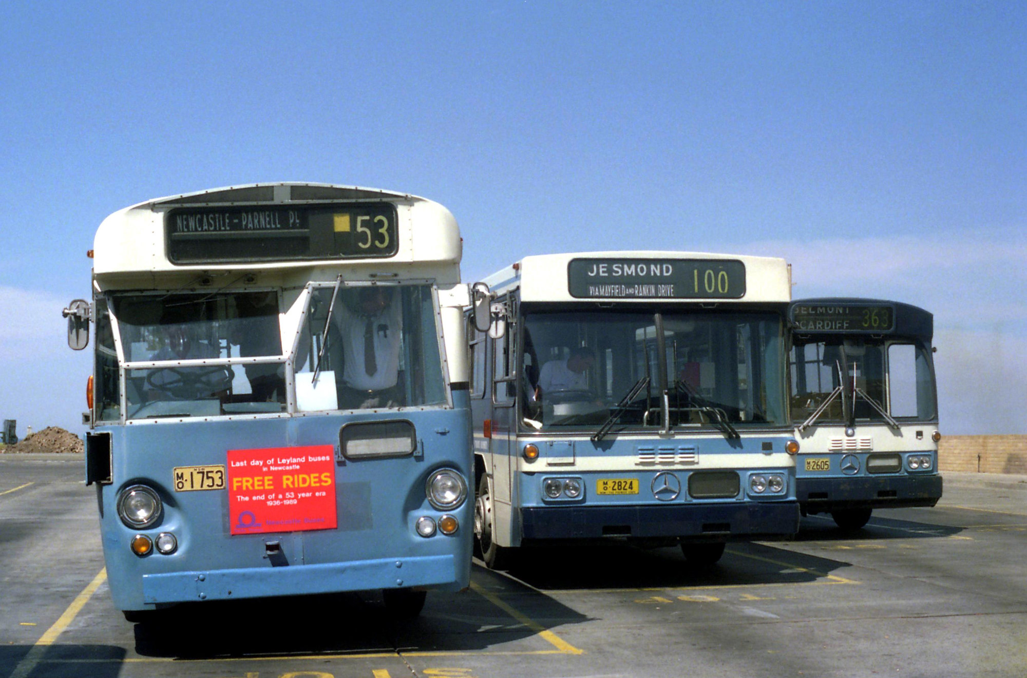 UTA Leyland Leopard MK II 1753, Mercedes 2824, 2605, terminus off Parnell Place, Newcastle, NSW, 22 September 1989