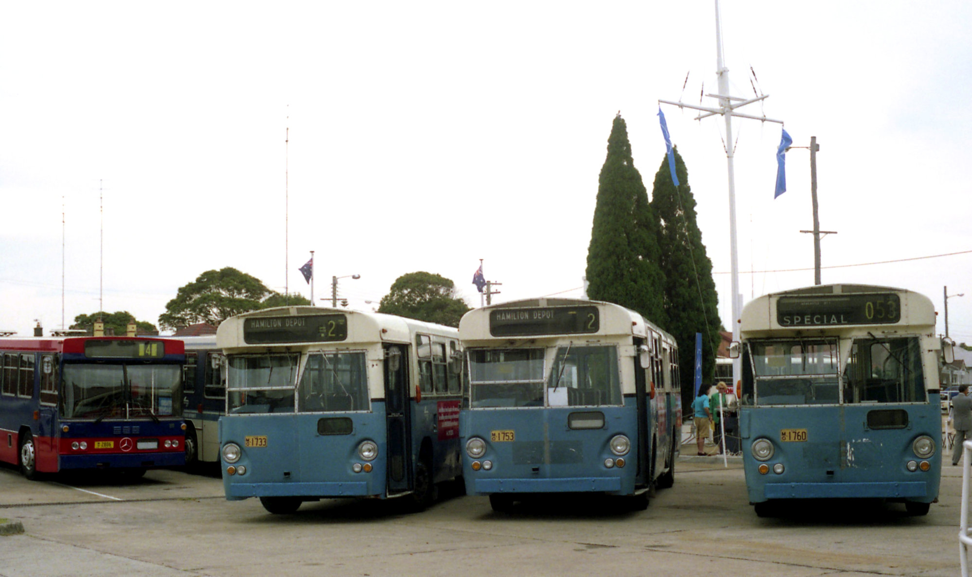 UTA Mercedes O305 MK IV 2806 Leyland Leopard MK IIs 1733 1753 1760, depot yard, Denison Street, Newcastle, NSW, 22 September 1989