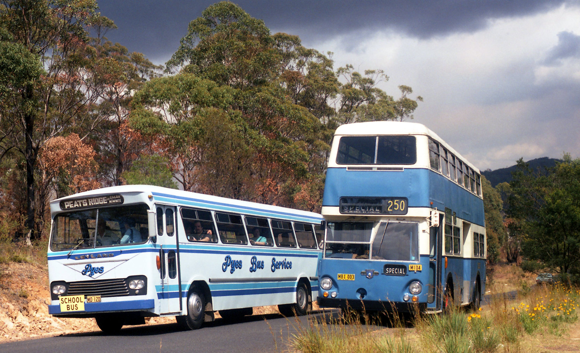 Pye's Leyland Viking VK41 MO-120, LGB Leyland Atlantean MBI-003 (x DGT 1003), local street in Gosford area, NSW, 29 October 1989