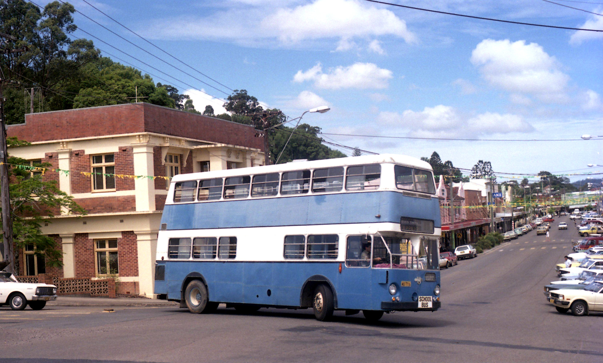 Taylor of Murwillumbah Leyland Atlantean MO-7716 (ex DGT 1043) at corner of streets in Murwillumbah, NSW, 24 November 1989