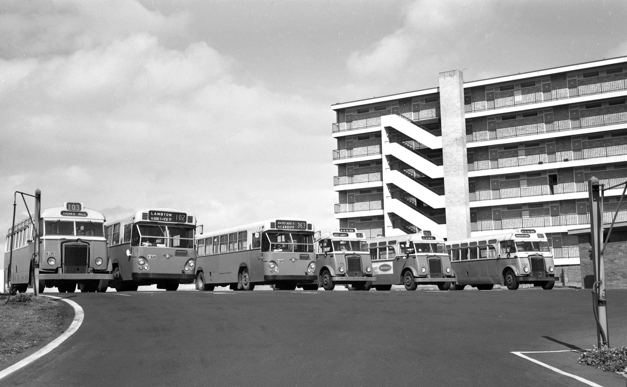 Ward, John, DGT Leyland OPD2-1 SD 2857, Leyland Leopard MK Is 3688, 3609, Leyland OPS2-1 2595, Leyland OPD2-1 SD 2814, Leyland 2601, terminus, Parnell Place, Newcastle, NSW, 16 August 1969 (16th August 1969), [25263_160869_6994-A]. Living Histories, accessed 15/04/2026, https://livinghistories.newcastle.edu.au/nodes/view/93300