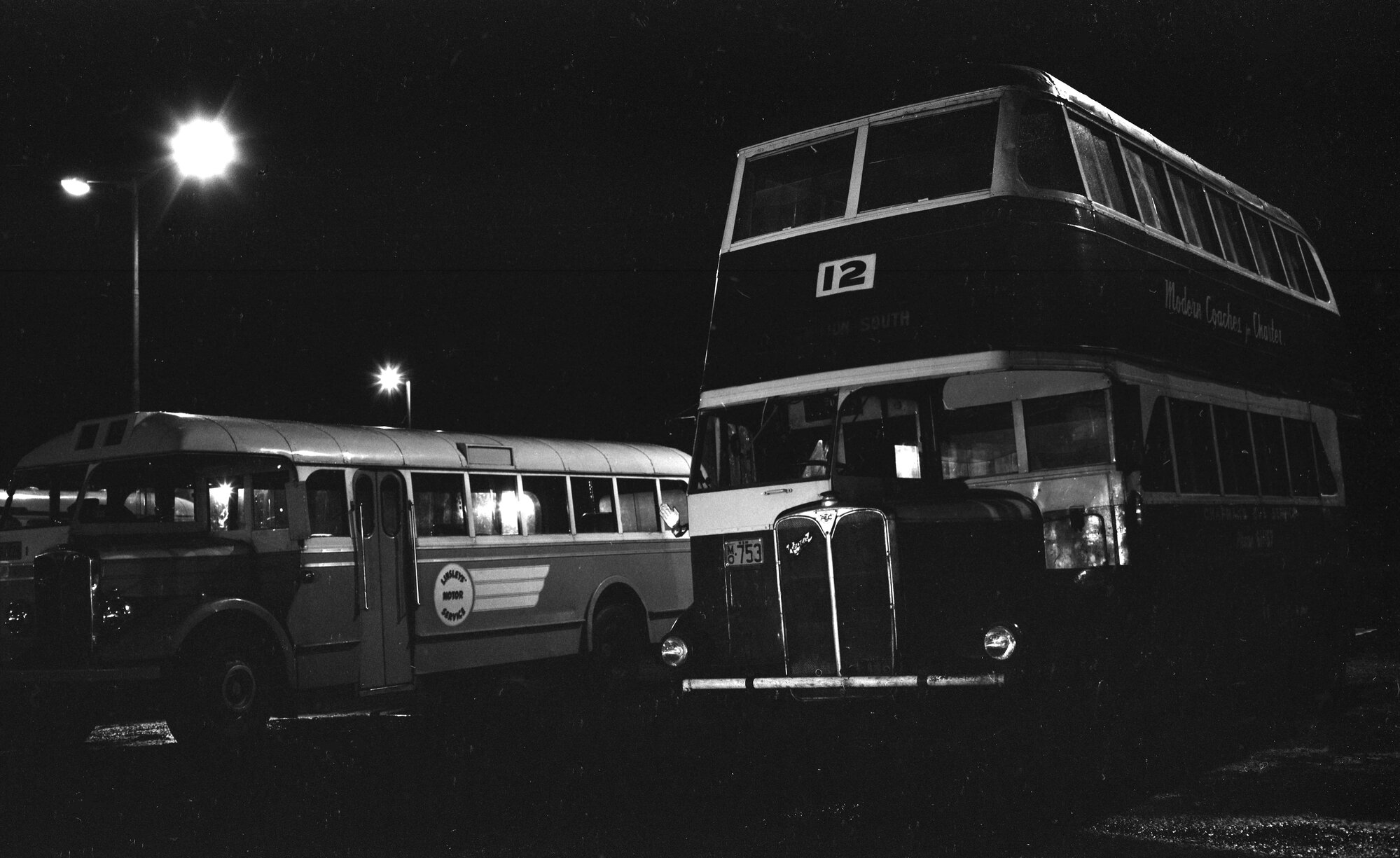 Linsleys AEC Regal 4428 Chapmand AEC Regent 753 (1577), night time, Selwyn Street, Port Waratah, NSW, 16 August 1969
