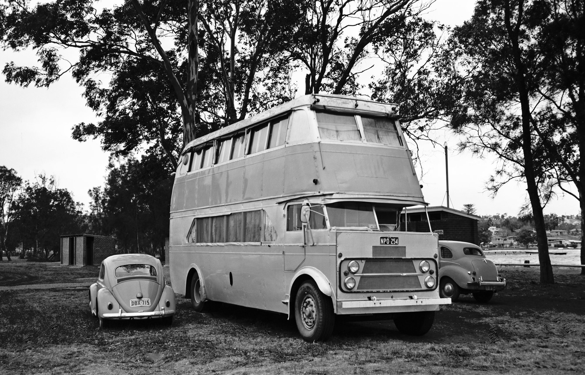 Unknown owner Leyland TD5 NPO-254 (x DRT&T 1432) in park beside Lake Macquarie at Eleebana, NSW, 24 July 1971