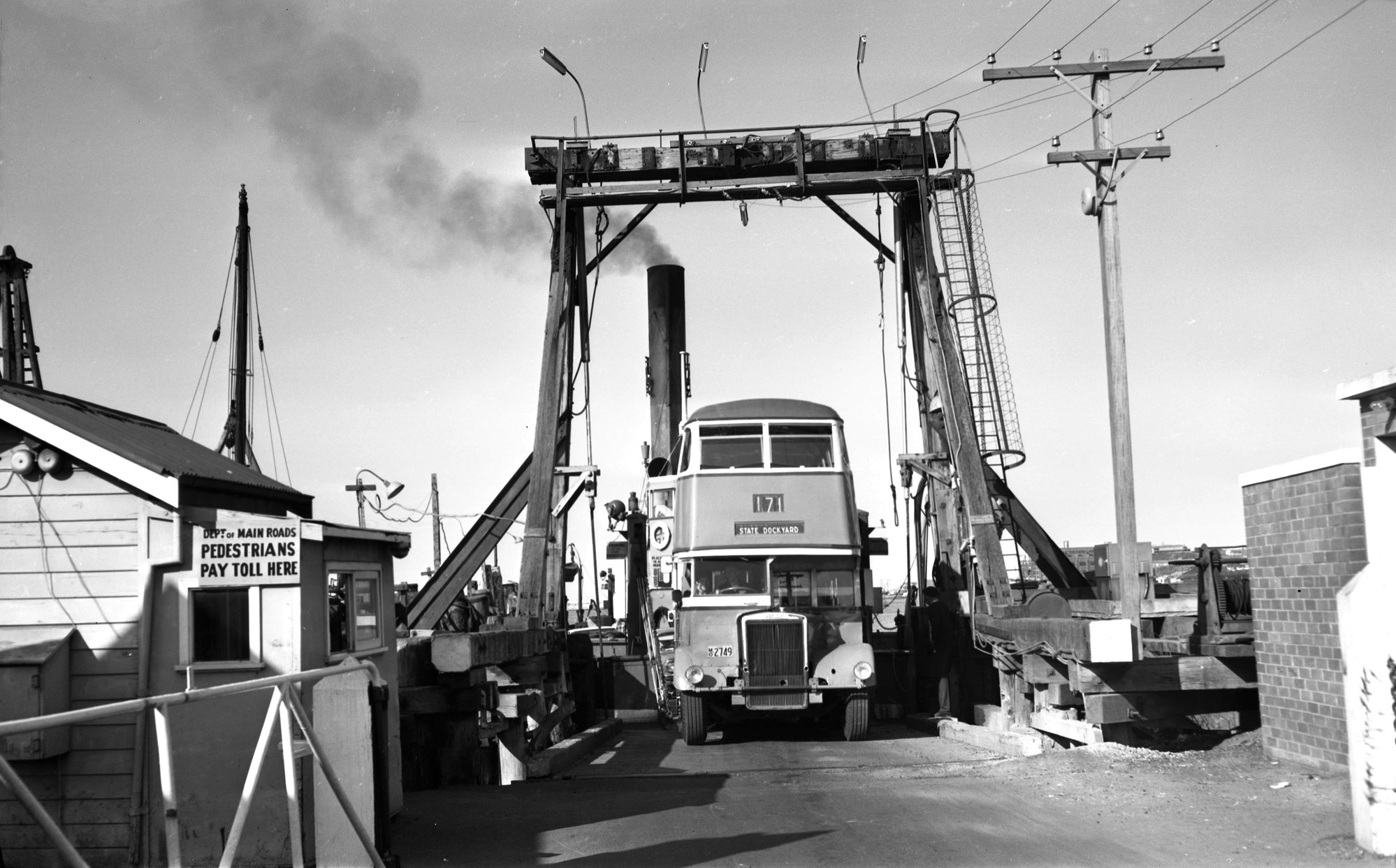Ward, John, DGT Leyland OPD2-1 2749 coming off ferry Koondooloo, Wharf Road, Newcastle, NSW, 18 September 1971 (18th September 1971), [26041_180971_7183-G]. Living Histories, accessed 15/01/2026, https://livinghistories.newcastle.edu.au/nodes/view/93377