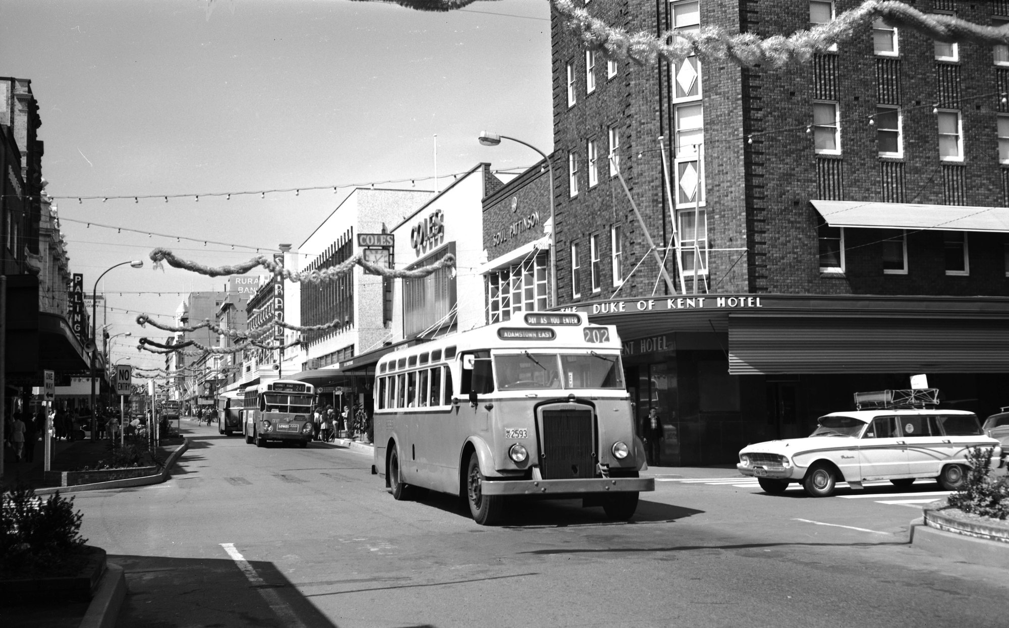 Ward, John, DGT Leyland OPS2-1 2593, Leyland Leopard MK I 3678 & others, Hunter Street at Wolfe Street, Newcastle, NSW, 18 September 1971 (18th September 1971), [26047_180971_7184-E]. Living Histories, accessed 16/03/2026, https://livinghistories.newcastle.edu.au/nodes/view/93383