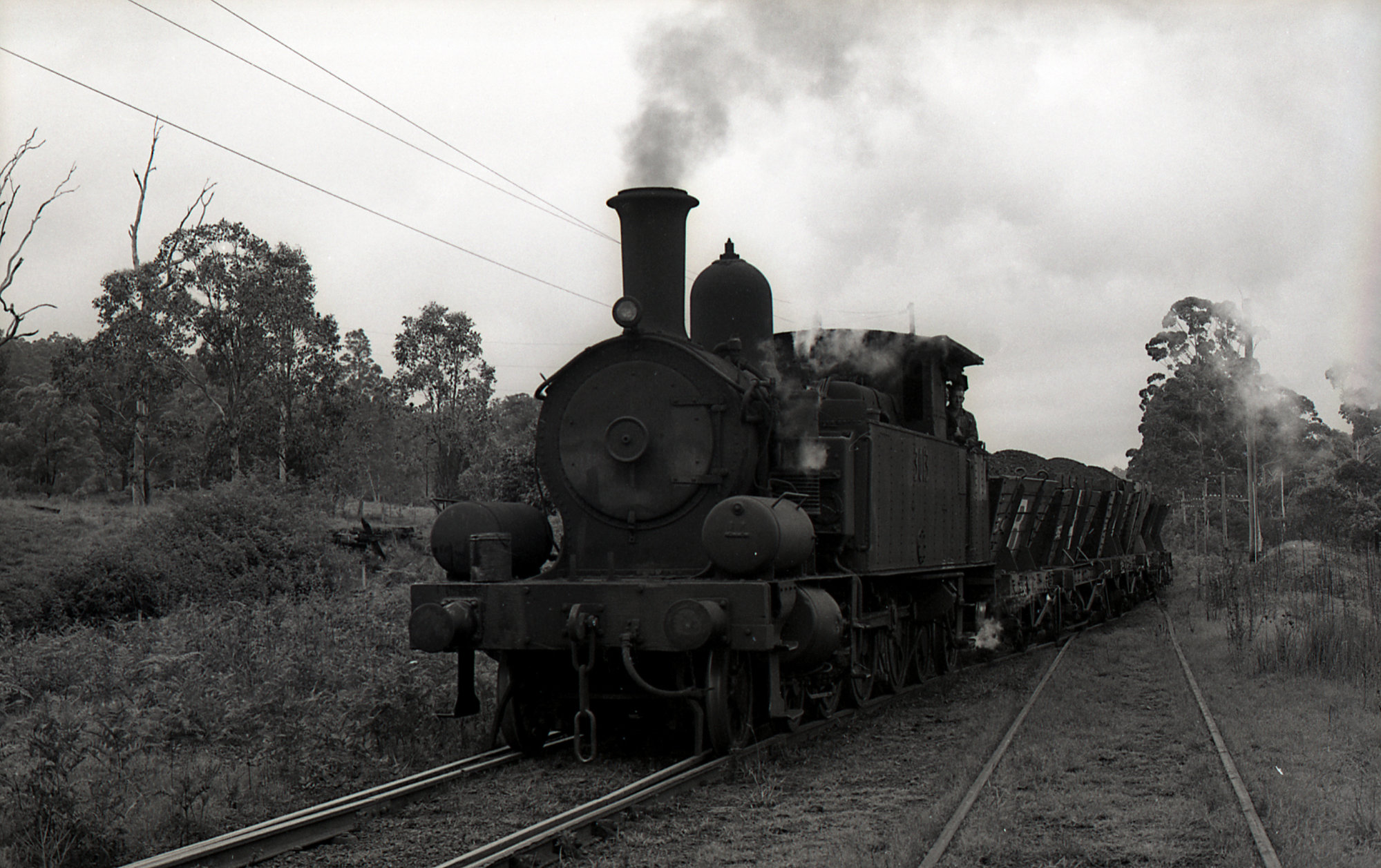 Locomotive 3013 leaves Doghole Stockrington, NSW, Richmond Vale Railway, February 1973