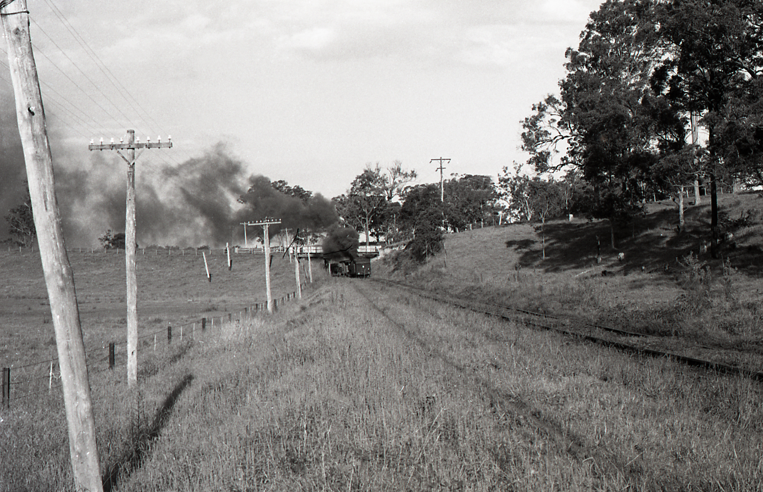 Locomotive No. 9 'Pelaw Main' approaches Doghole Stockrington, NSW, Richmond Vale Railway, February 1973