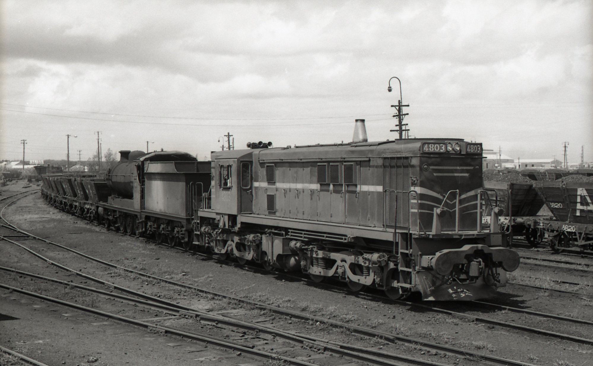 Locomotive 4803 and ROD 24 on train at Hexham, NSW, ready to go to South Maitland Railways, 27 February 1973, Richmond Vale Railway
