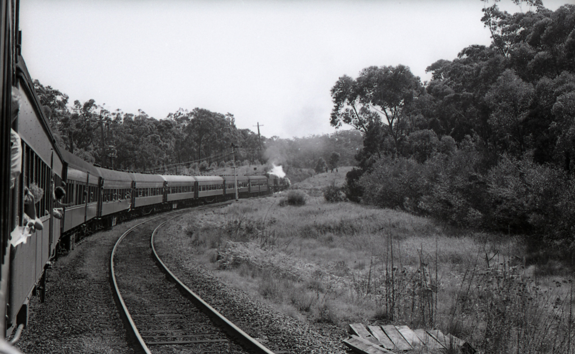 View from train hauled by Garratt 6042, 4 March 1973, on way to Sydney for withdrawal from service