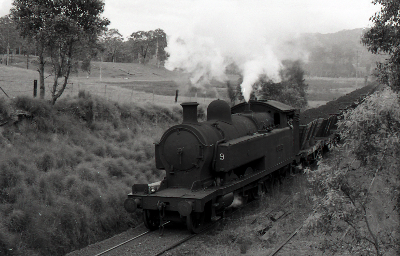 Locomotive No. 9 'Pelaw Main' on loaded train passes under Maitland Road Bridge, 20 March 1973