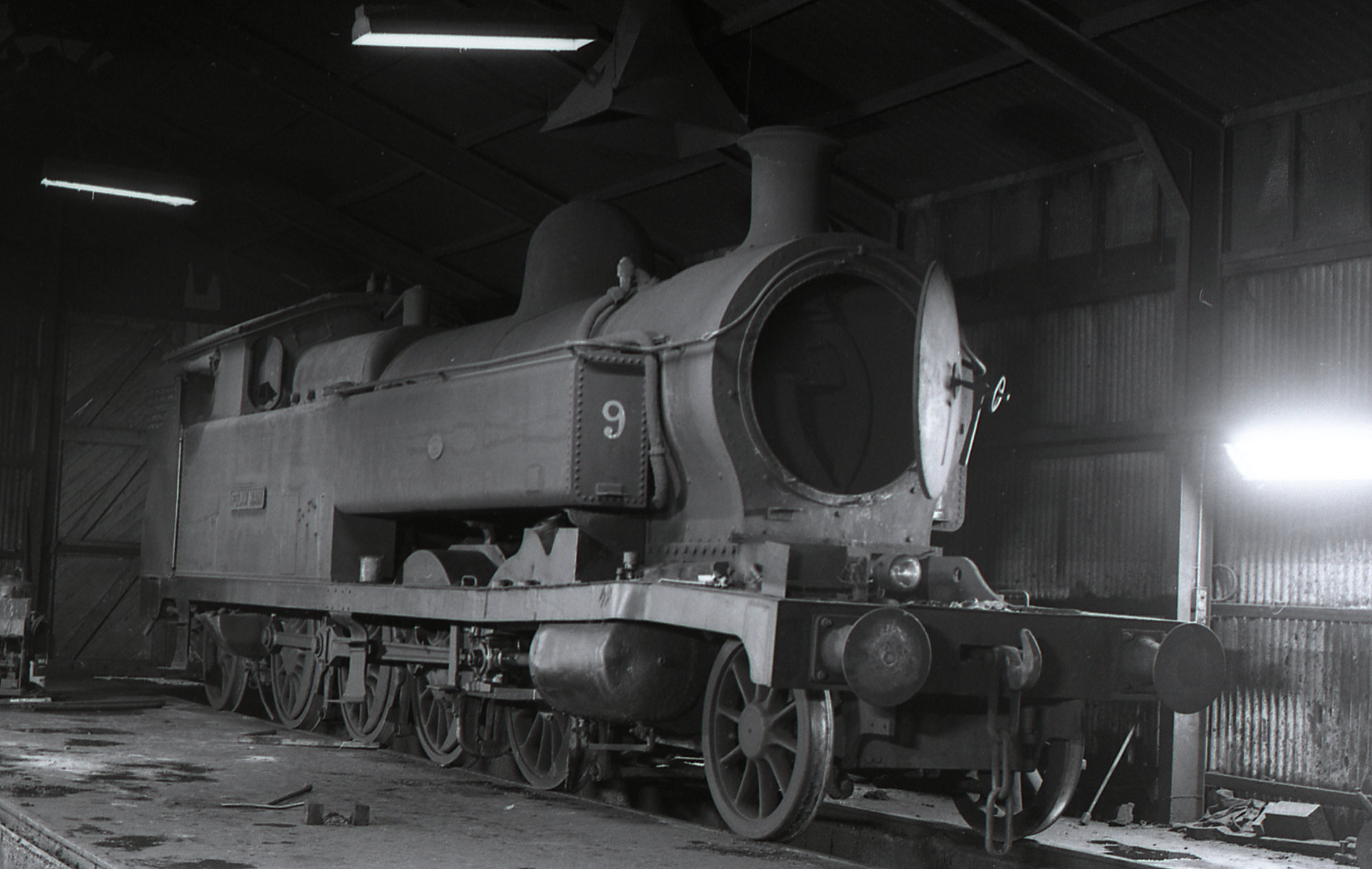 Night time shot of ROD No. 9 at Loco shed, Hexham, NSW, Richmond Vale Railway, April 1973