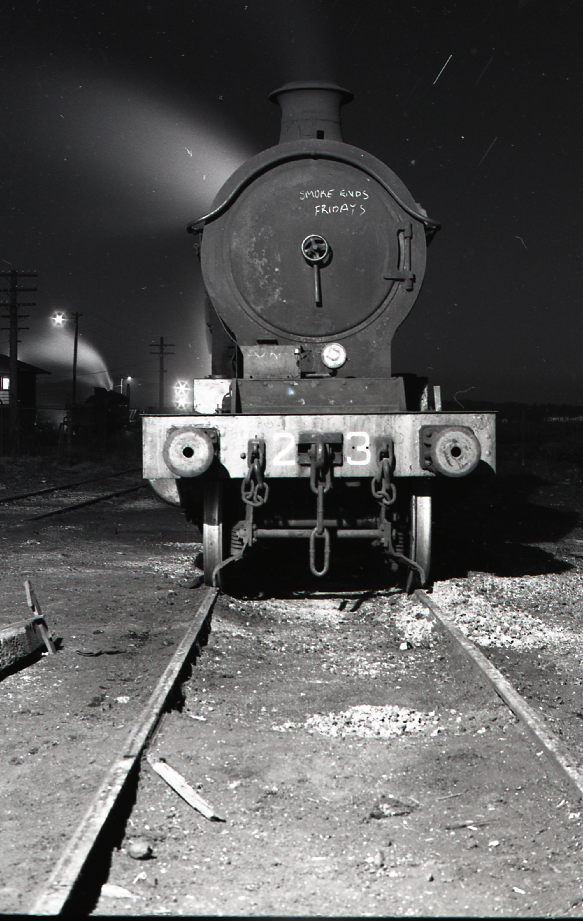 Night time shot of ROD 23 at Loco shed, Hexham, NSW, Richmond Vale Railway, April 1973