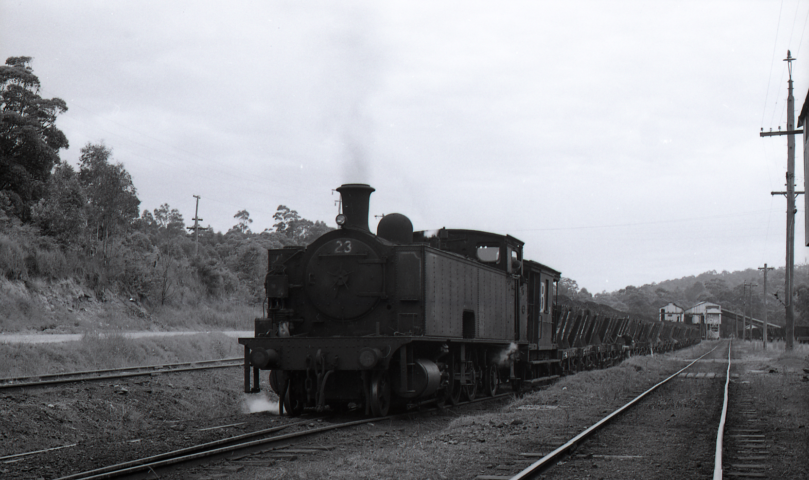 South Maitland Railways No. 23 in full sidings at Stockrington No. 2 Colliery, NSW, Richmond Vale Railway, April 1973
