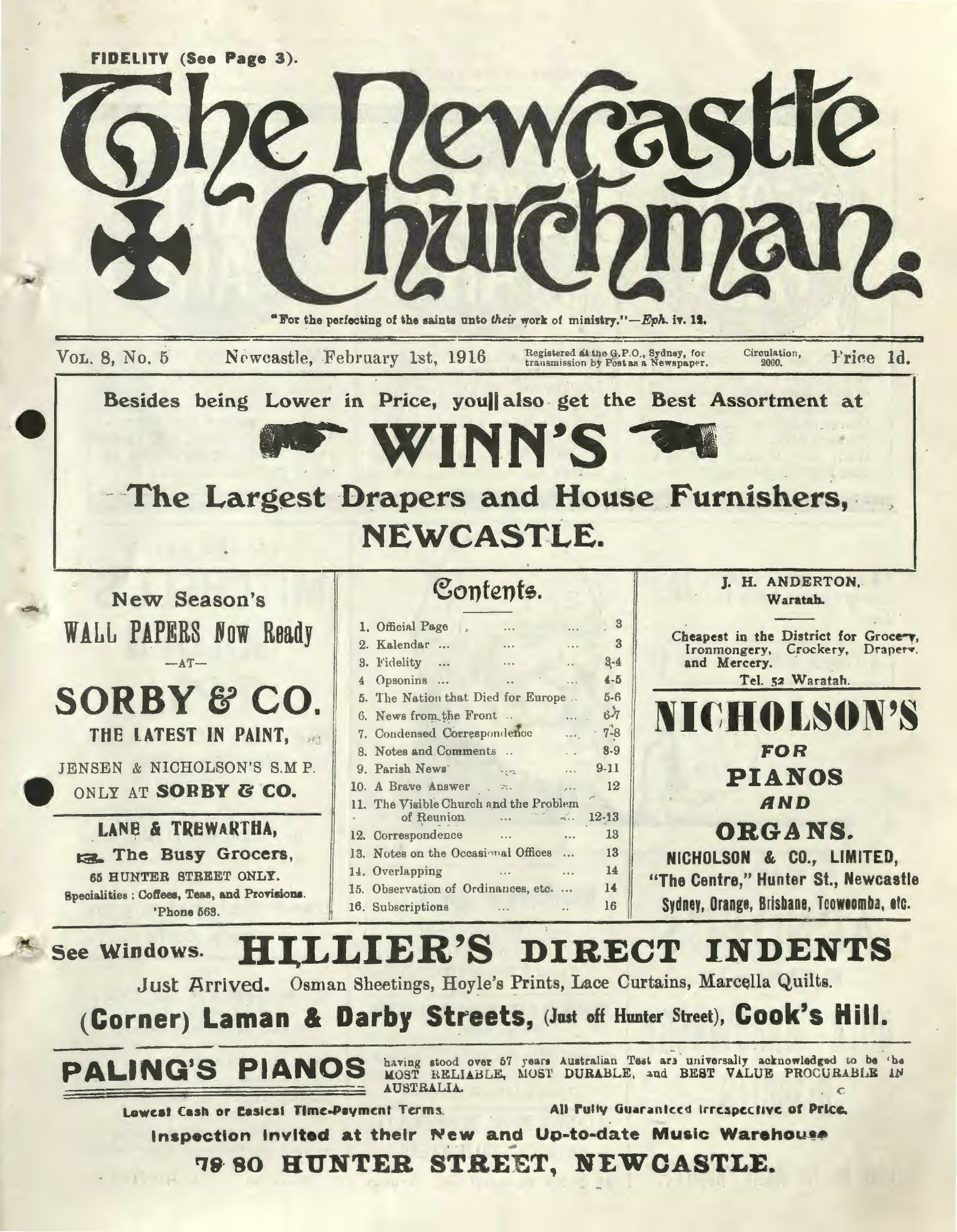 Anglican Church of Australia. Diocese of Newcastle, The Newcastle Churchman, Vol. 8, No. 05, 1 February 1916 (1st February 1916), [B9061]. Living Histories, accessed 14/04/2026, https://livinghistories.newcastle.edu.au/nodes/view/94380