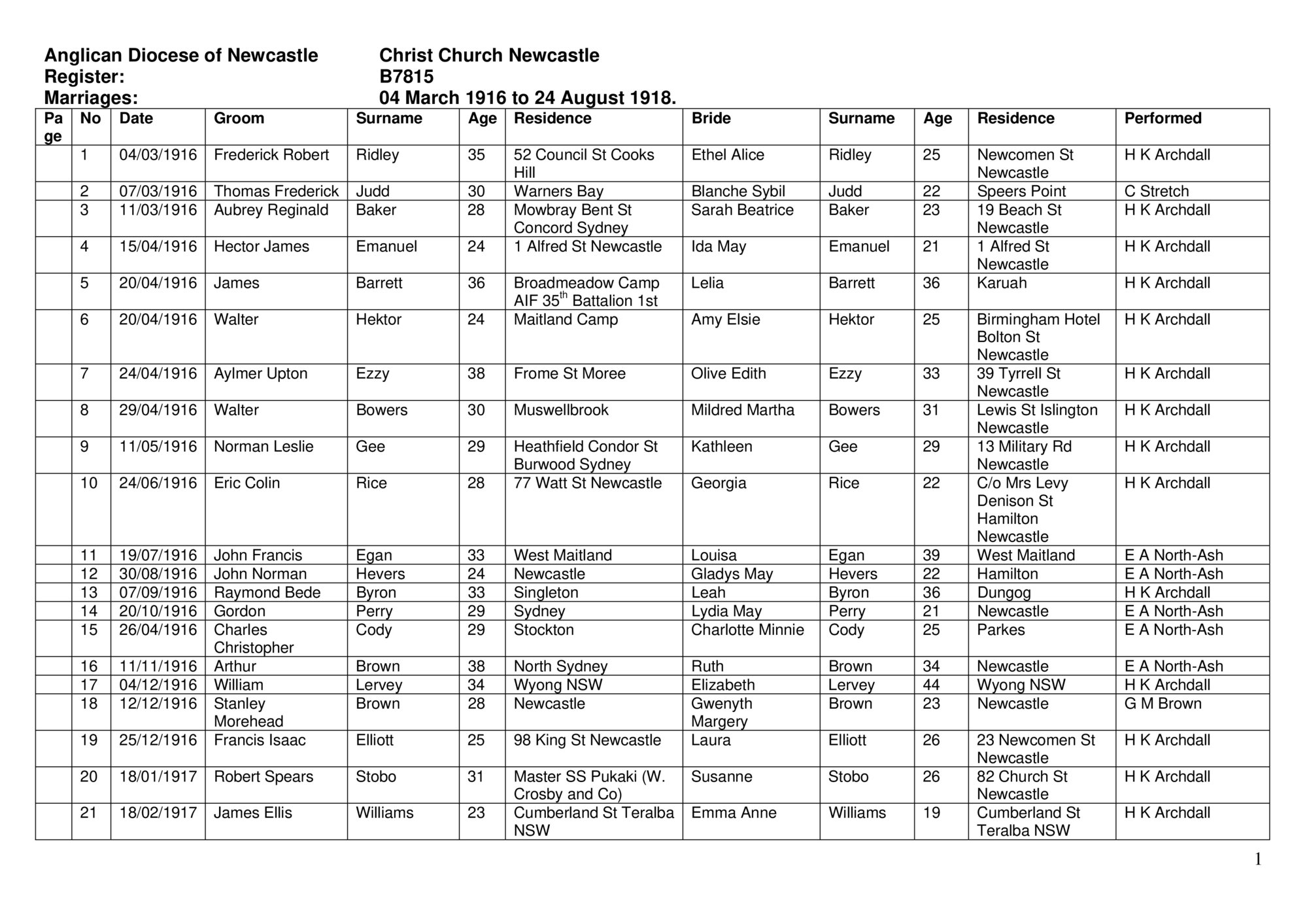 Anglican Church of Australia. Diocese of Newcastle, Transcription: register of marriages, Christ Church Cathedral, Newcastle, NSW, 1916 - 1918, [B7815]. Living Histories, accessed 05/04/2026, https://livinghistories.newcastle.edu.au/nodes/view/94954