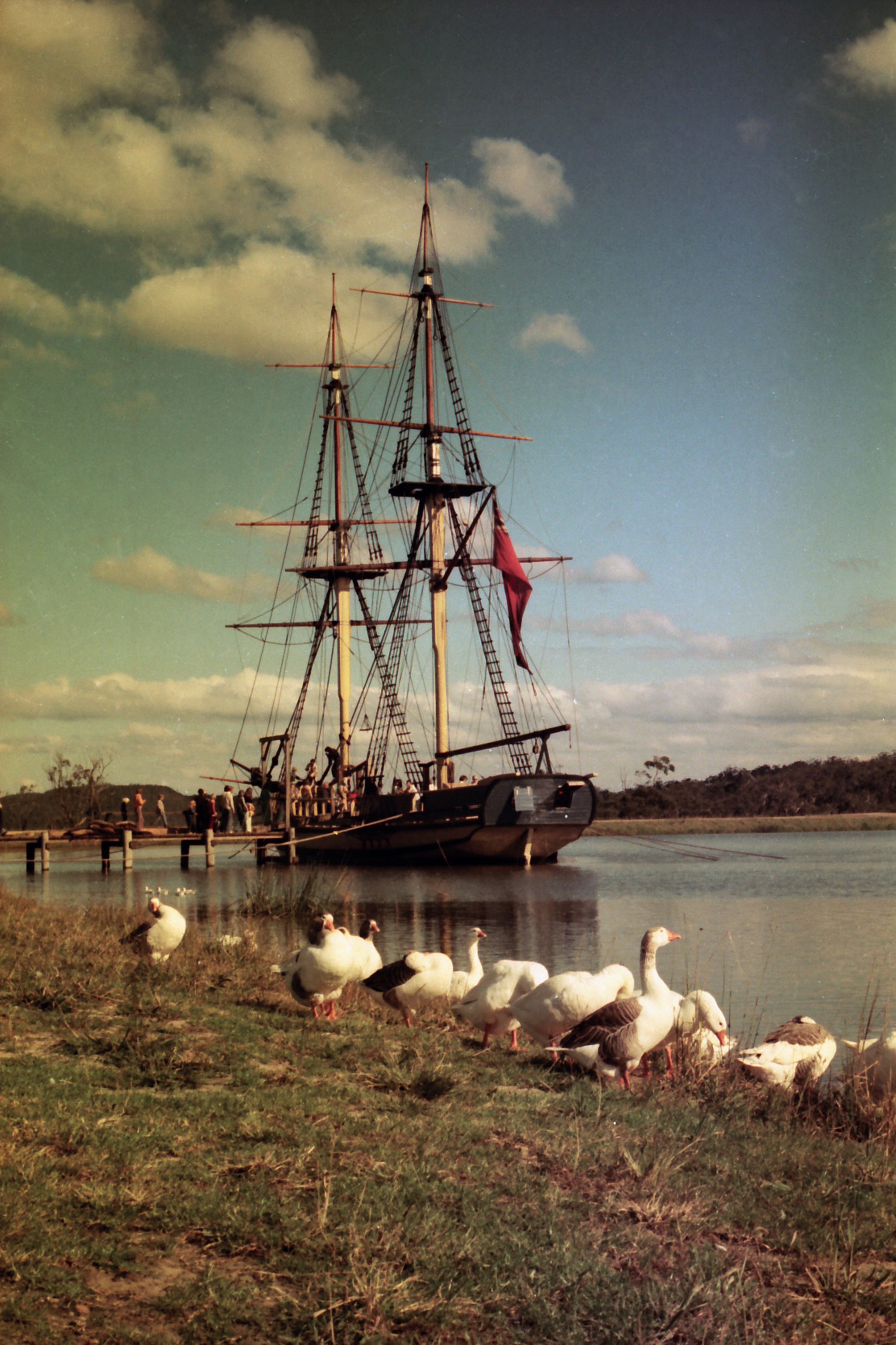 Howard, Barry, Geese near moored sailing ship, Old Sydney Town, Somersby, NSW, [1970s] ([1970s]), [OL_BH_OST_0058]. Living Histories, accessed 19/02/2026, https://livinghistories.newcastle.edu.au/nodes/view/95629