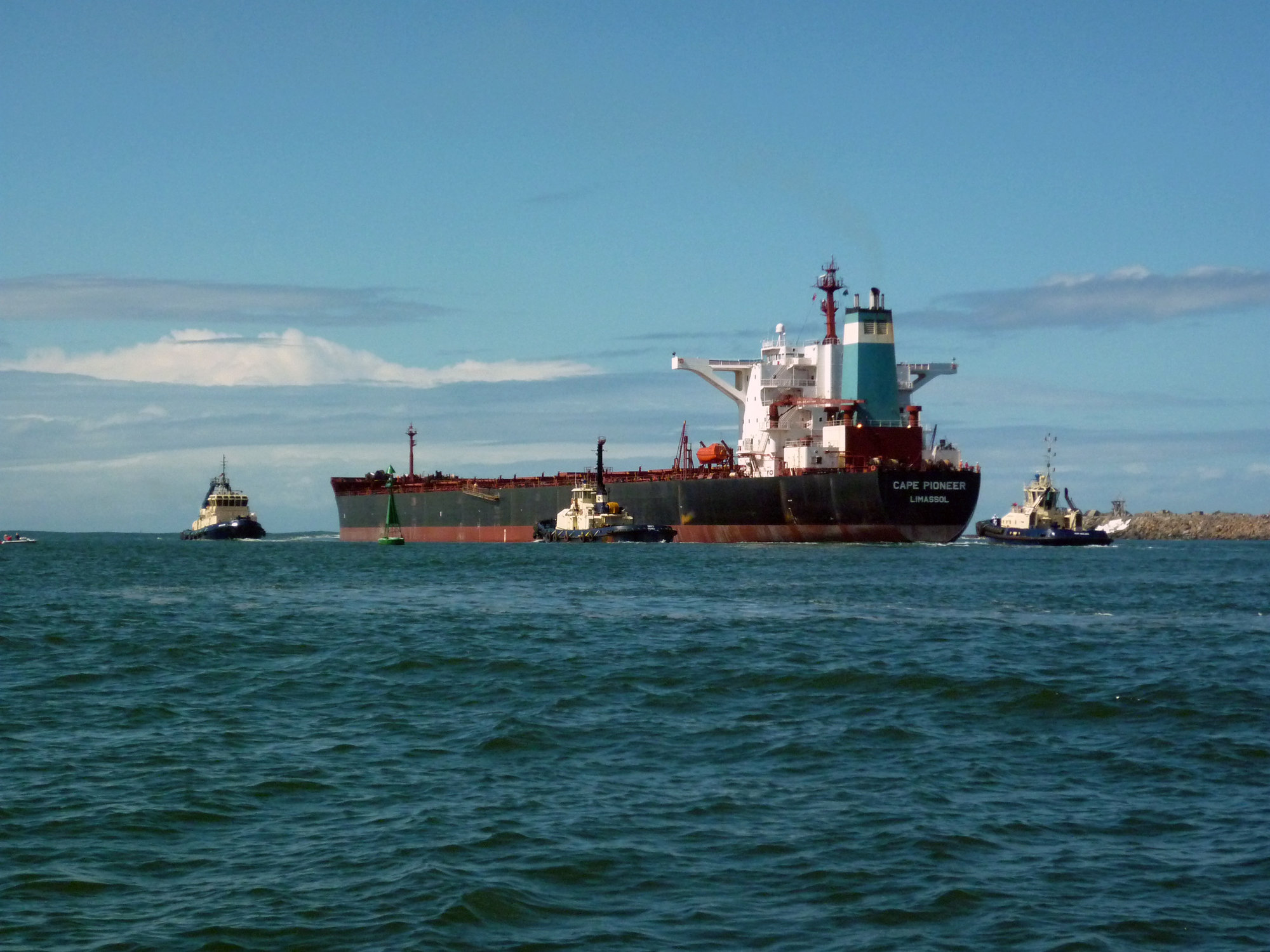 Cape Pioneer (bulk carrier) leaves Newcastle Harbour, NSW escorted by tugboats, 5 April 2010