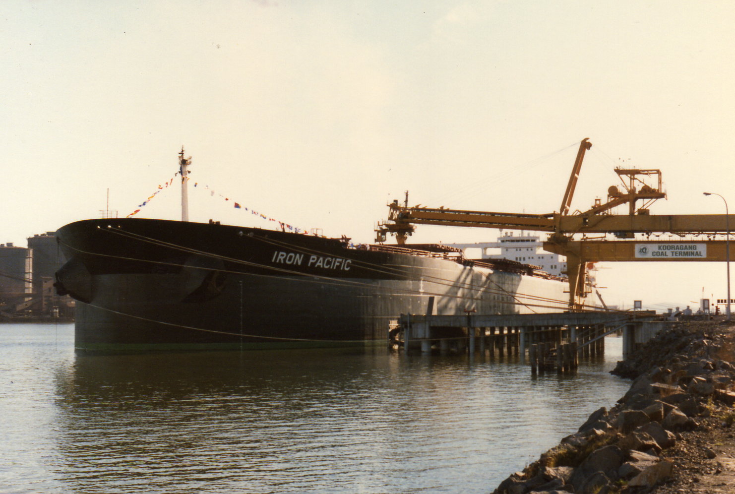 Kooragang Coal Loader, K4, "MV Iron Pacific", loading, 1 August 1986, 187.500 tonnes (1986), [1986 KCL K4 Iron Pacific loading 1.8.1986 187.500 tonnes (1)]. Living Histories, accessed 11/02/2026, https://livinghistories.newcastle.edu.au/nodes/view/95960