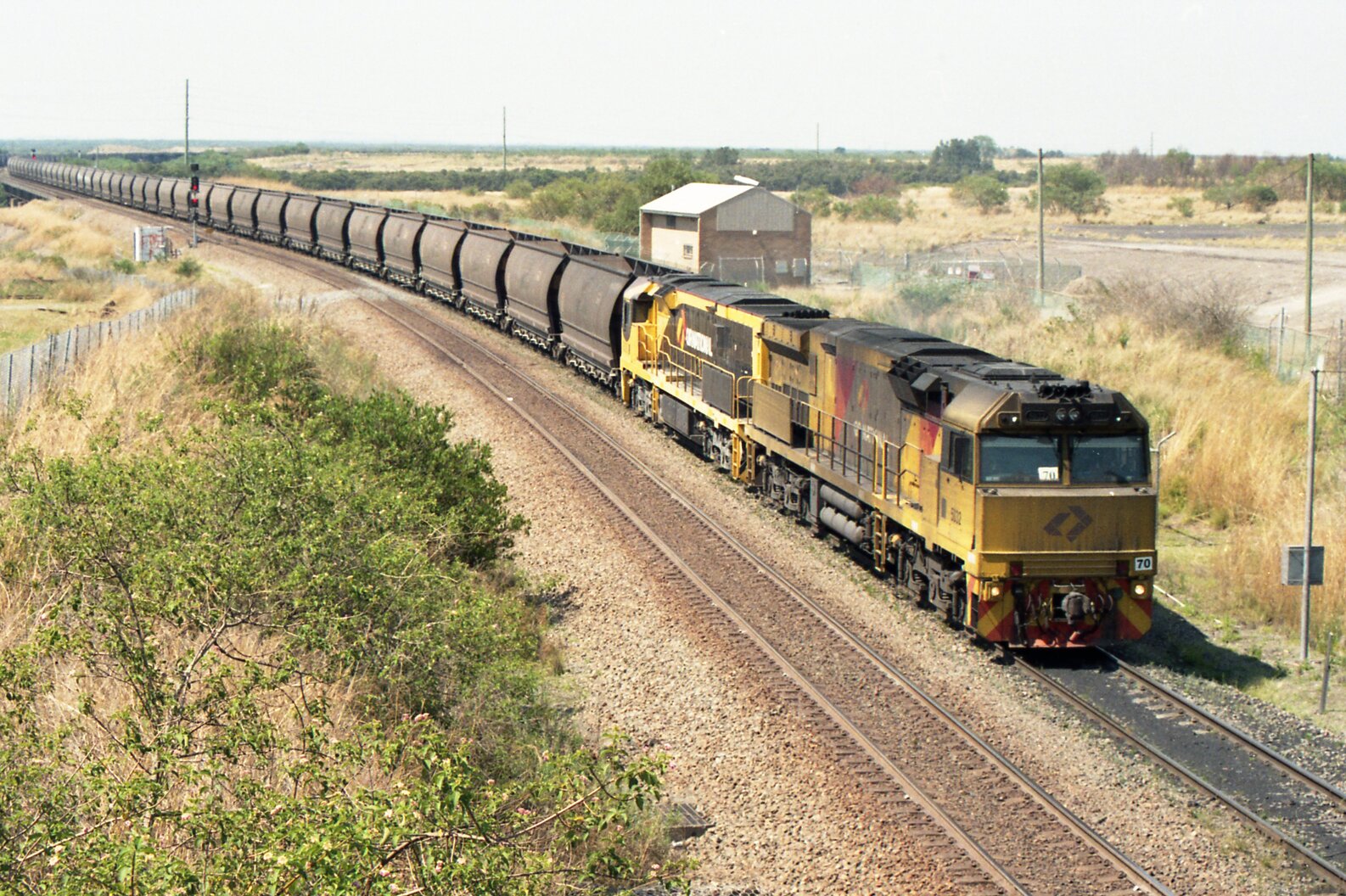 Kooragang. Two Aurizon 5000 class locomotives head unit 70 across the Hunter River