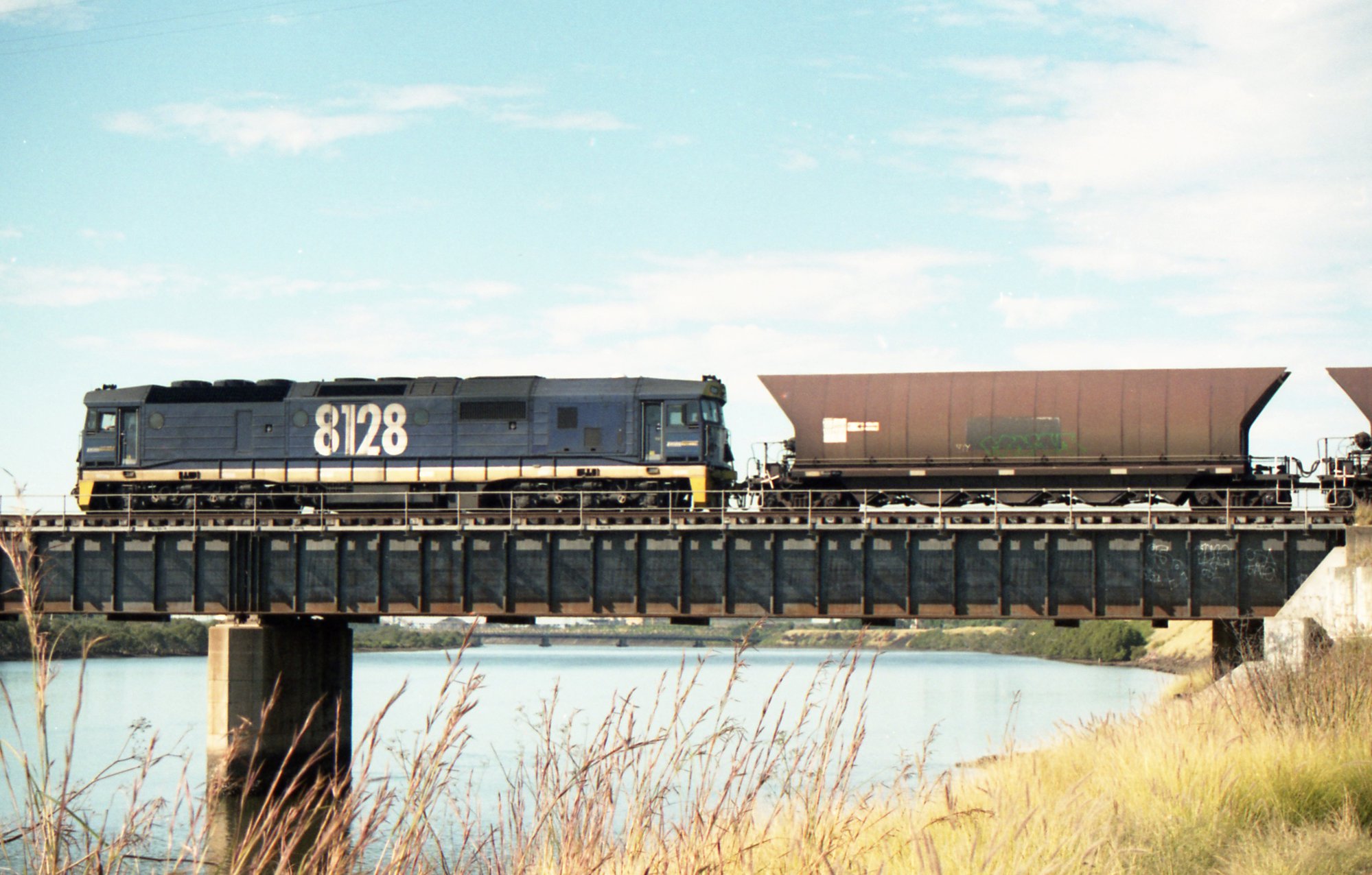 Sansom, Peter, 8128 with a rake of batwings crossing the Hunter River bridge at Sandgate, NSW, April 2006 (Between 1st April 2006 and 30th April 2006), [OL_Sansom_Kooragang_201909_0041]. Living Histories, accessed 19/03/2026, https://livinghistories.newcastle.edu.au/nodes/view/96750