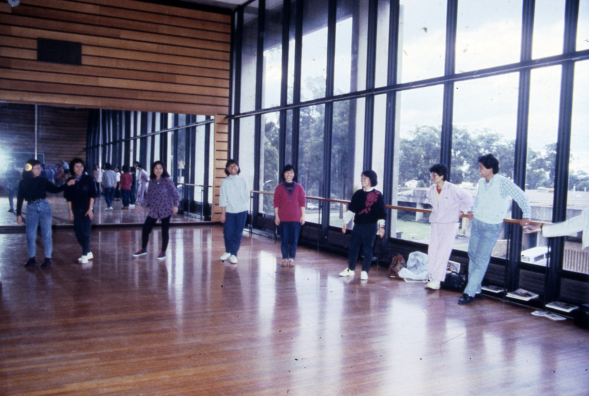 Medical Communication Unit, University of Newcastle, Australia, Asian students on floorboards (Hunter side?) - Medical Communication Unit, the University of Newcastle, Australia, [MCU-AsianStudents-Dancing001]. Living Histories, accessed 19/03/2026, https://livinghistories.newcastle.edu.au/nodes/view/9712