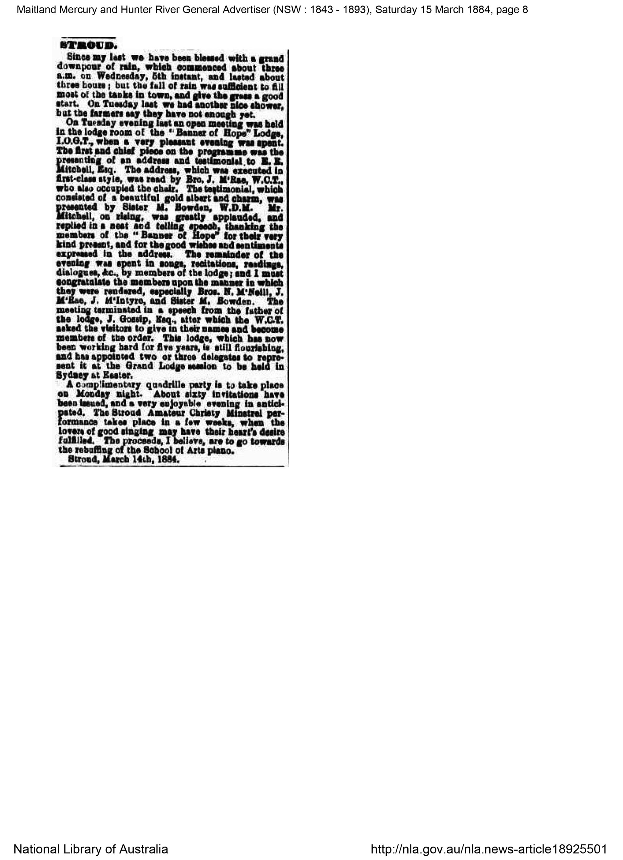 Maitland Mercury and Hunter River General Advertiser (NSW : 1843 - 1893), Open meeting of the Lodge Banner of Hope, 15 March 1884, [IOGT_BOH_1884 March 15]. Living Histories, accessed 29/03/2026, https://livinghistories.newcastle.edu.au/nodes/view/97121