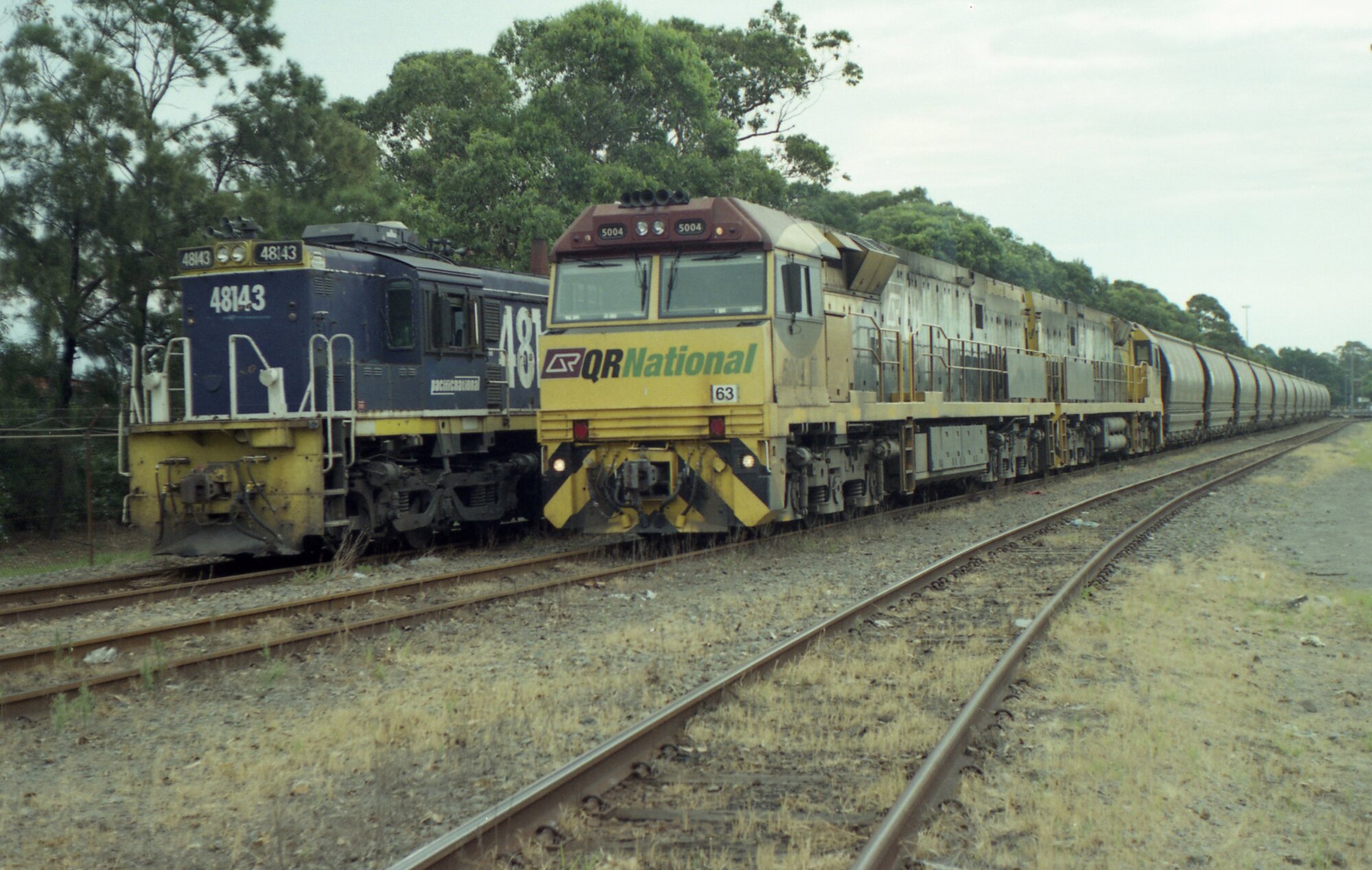 QR National 5003 and a classmate on unit 63 on two arrival stand next to 48143 on three arrival at Port Waratah, NSW