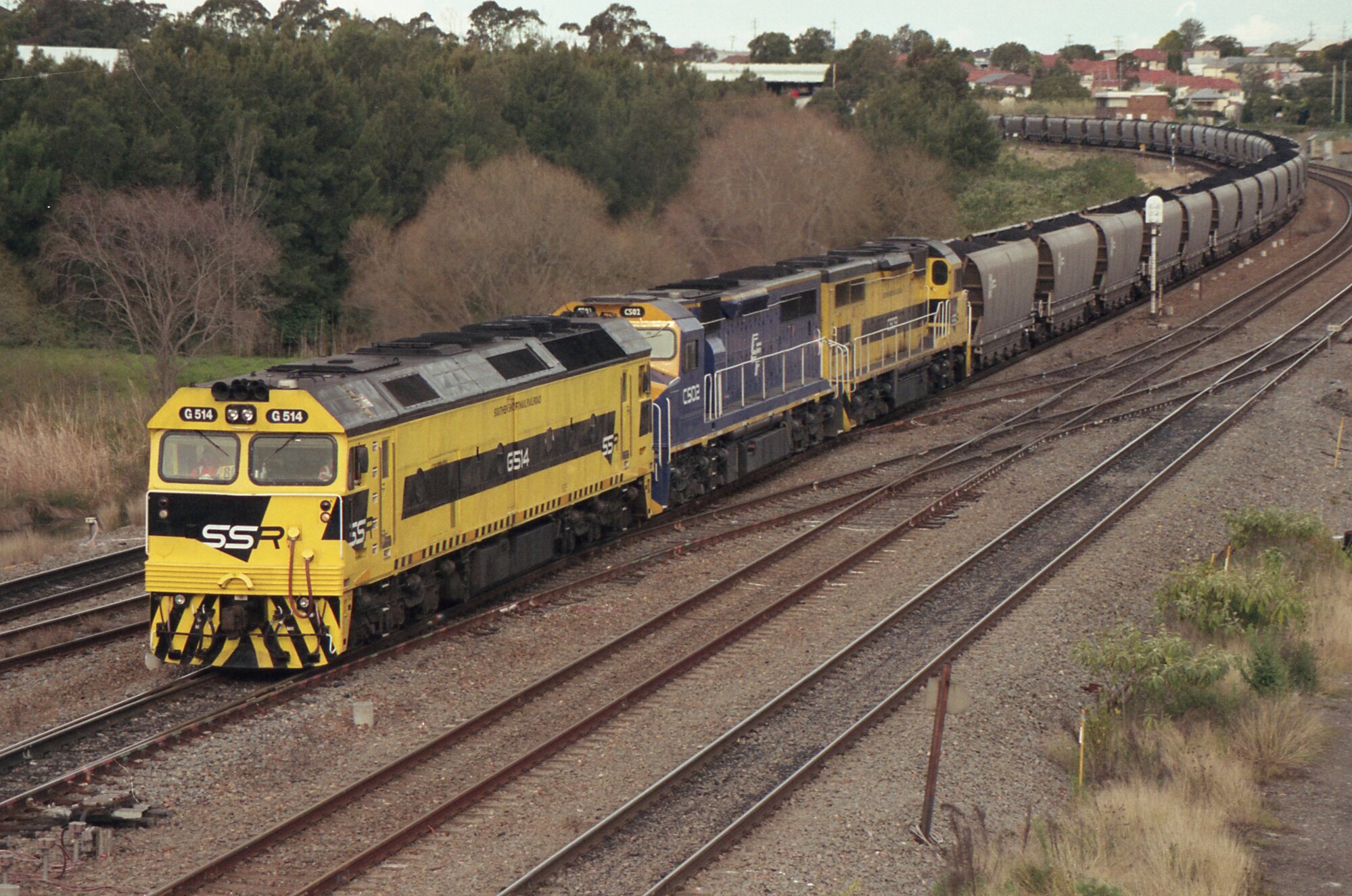 G514, C502 and another SSR locomotive trundle through Hanbury Junction on their way to Kooragang, NSW, July 2011